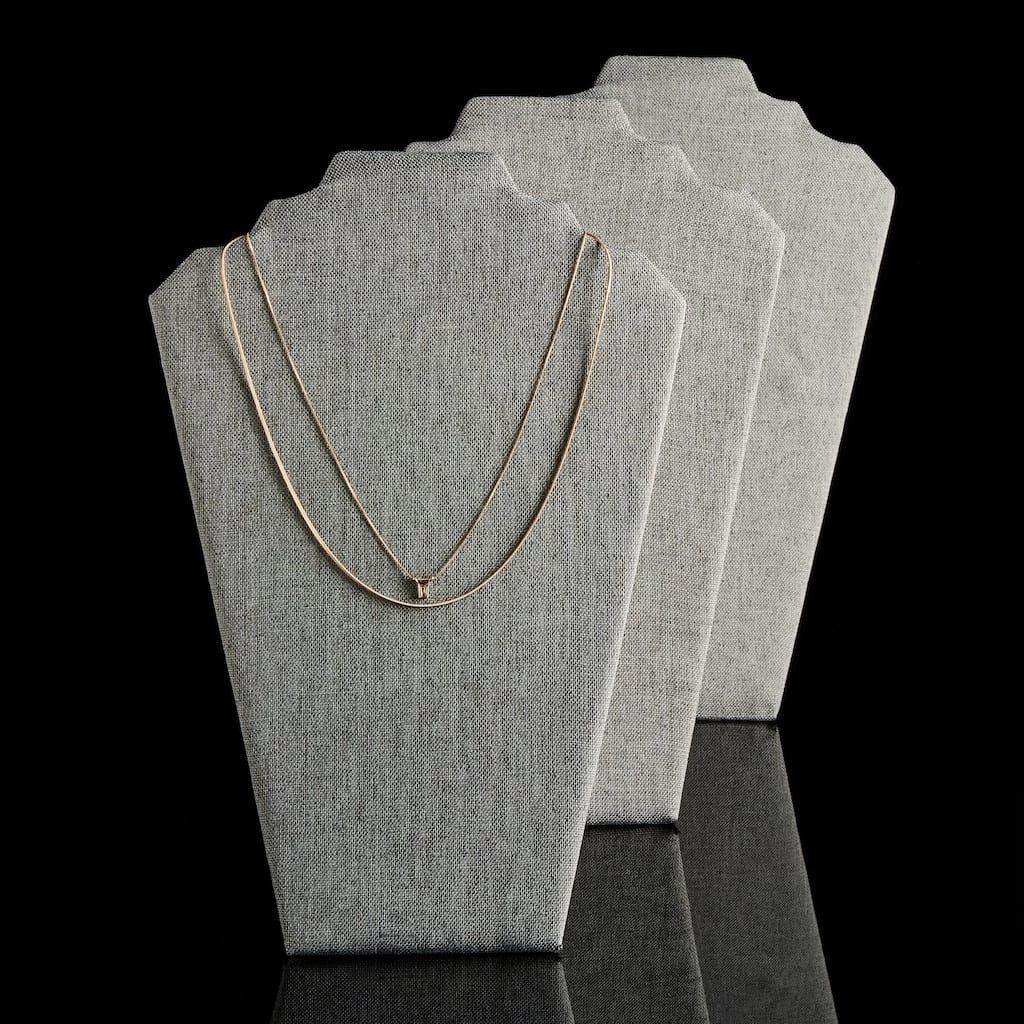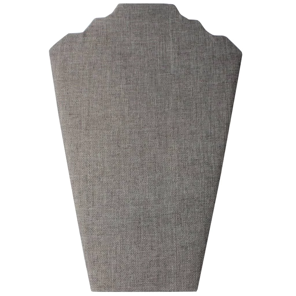 Display a beautiful necklace or debut a layered selection of necklaces varying in lengths with this dark gray fabric necklace stand. This stand provides a sleek, stylish backdrop for displaying a full range of necklace styles and lengths.