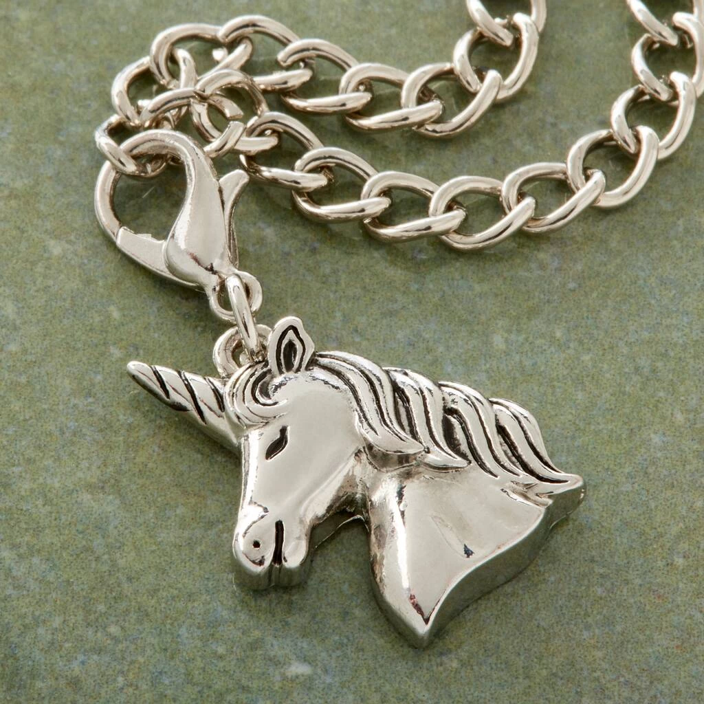 Create a custom jewelry piece with this adorable antique rhodium unicorn charm. It features a lobster clasp that can be easily attached to a necklace chain.