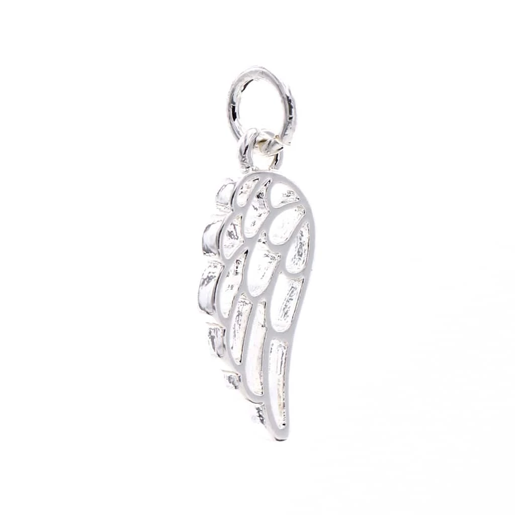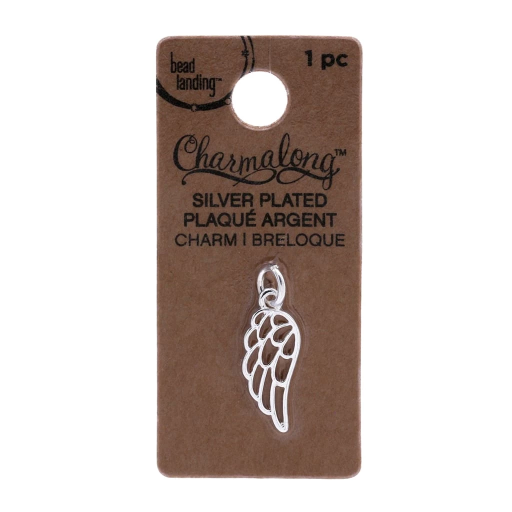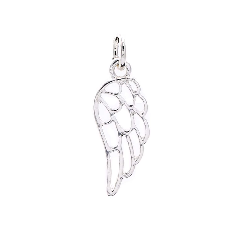 Design a necklace with this silver plated wing charm. This charm can also be connected to a bracelet or keychain.