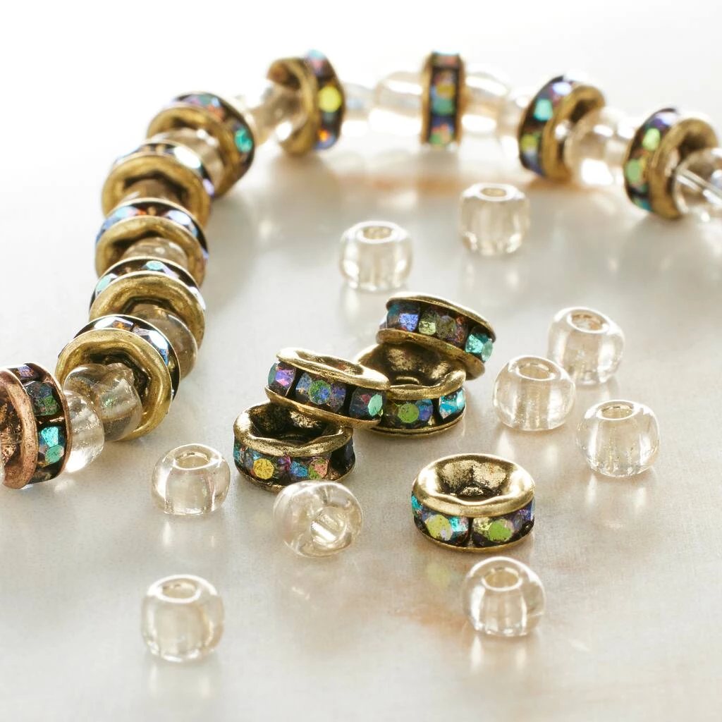 Ideal for all your jewelry making and beading projects! You will love the intense sparkle of the crystal aurora borealis rhinestones. These plated metal beads look great as spacers for your jewelry designs. They can be used in making one-of-a-kind items like necklaces, bracelets, earrings or more.