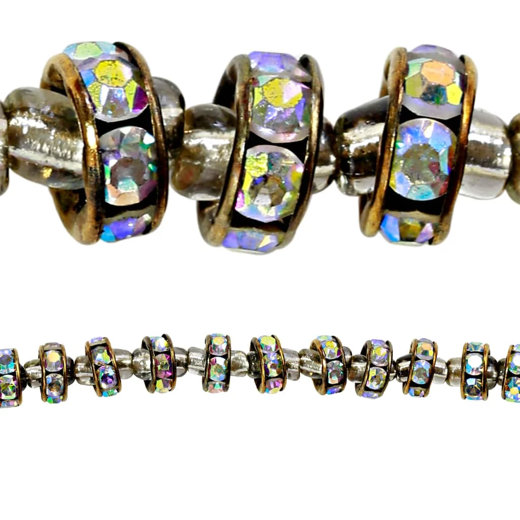 - Clear rhinestones set in antiqued brass-colored beads