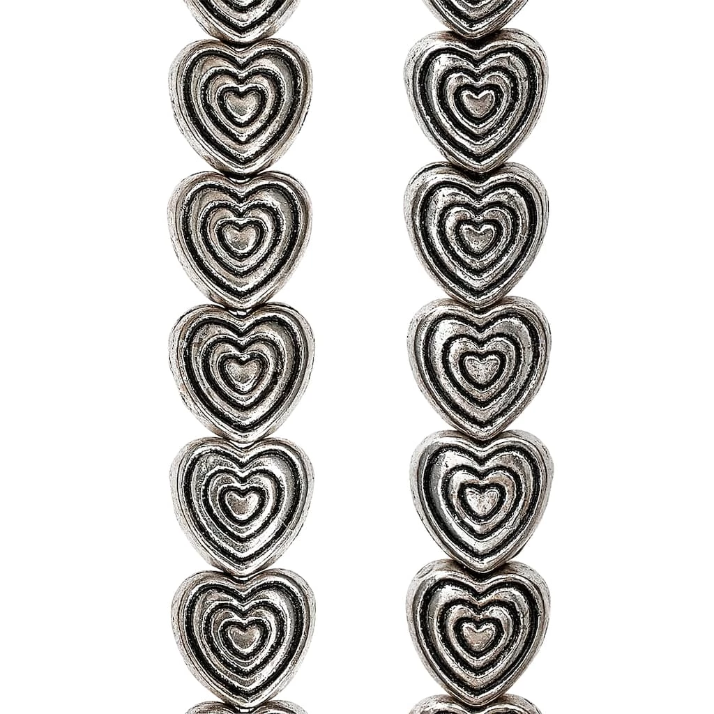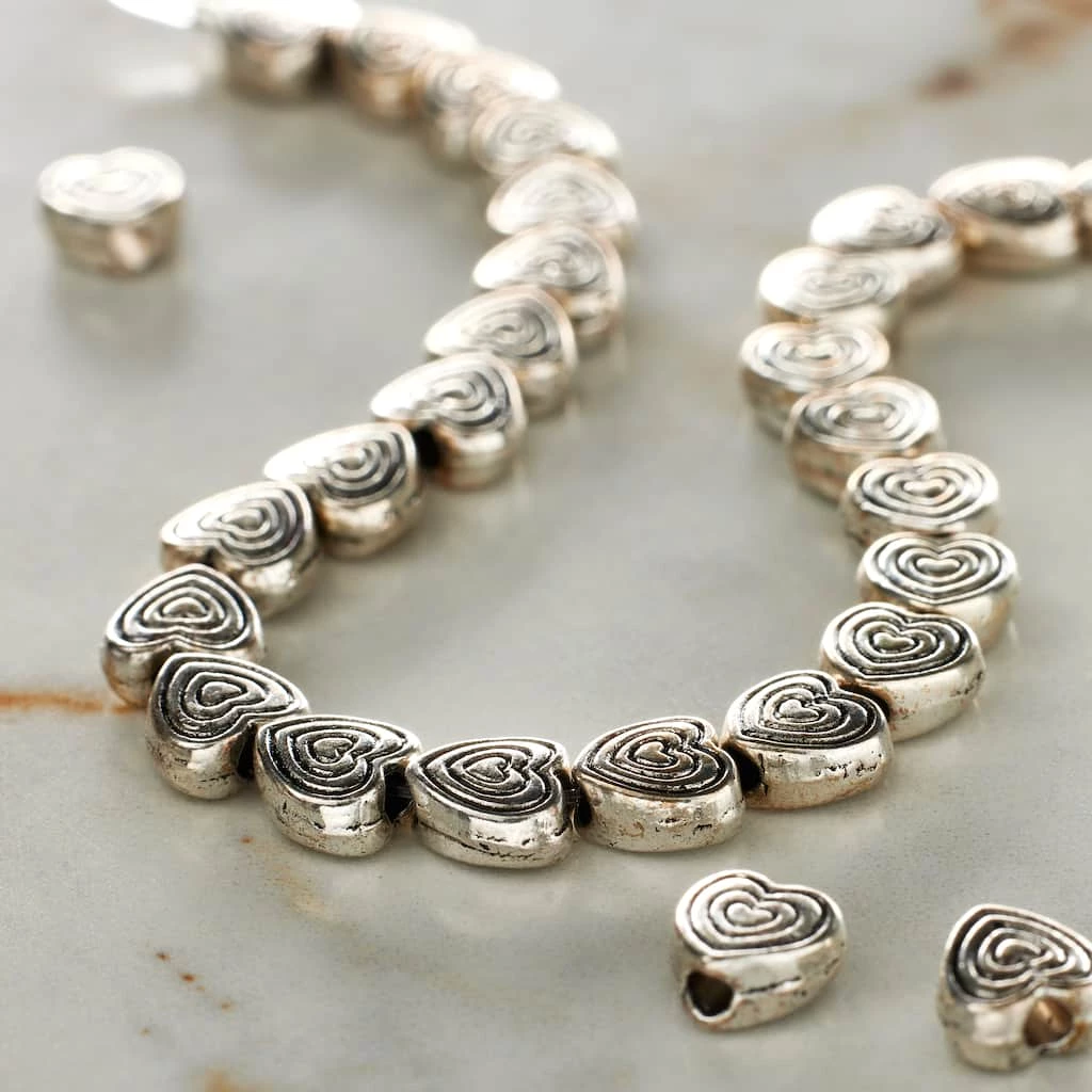 These pretty silver-plated beads feature carved hearts with three descending heart outlines on both sides. Combine them with other beads or a pendant to complete your one-of-a-kind design.