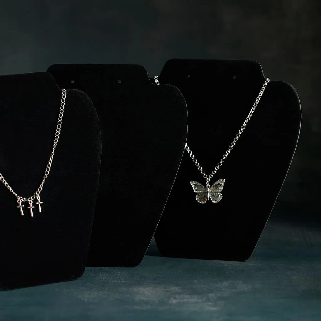 Display beautiful necklaces with these black velvet necklace stands. These easel stands provide a sleek, stylish backdrop for displaying a full range of necklace styles.