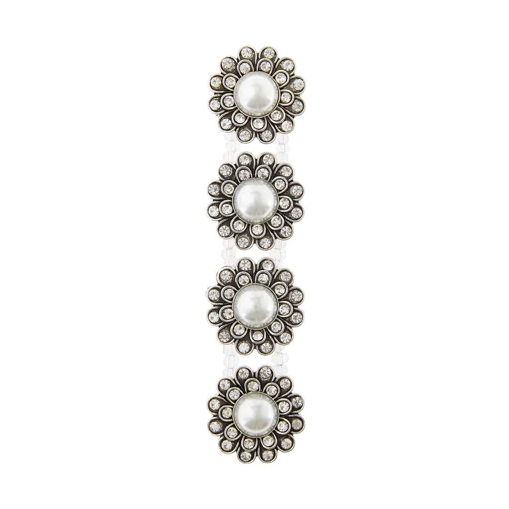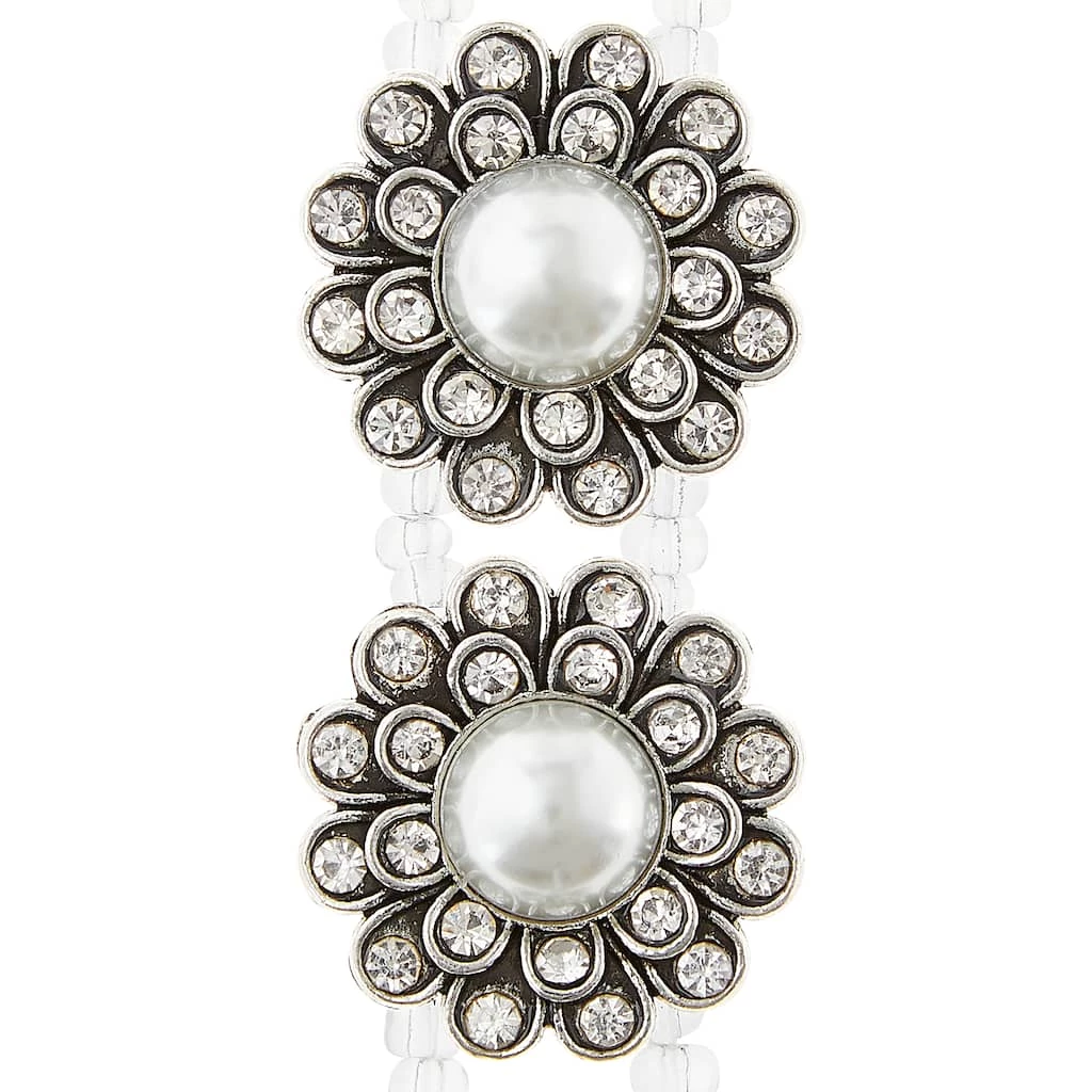 Design beautiful hair clips, brooches, and jewelry with the Bead Landing soldered large faux pearl flower slider. Its large flowers have faux pearl centers with stone-studded petals, making it ideal for accentuating stitchery, clothing and more. Pair this slider with other embellishments to make exquisite necklaces and décor accents.
