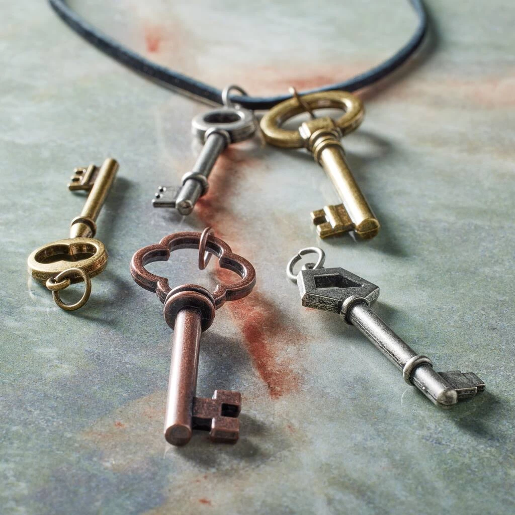 Use these Found Objects key charms by Bead Landing to craft beautiful necklaces. The mixed metal finishes of the charms give your projects a vintage appeal. String them on color coordinated metal chains to complete your project. For added visual appeal, you can also team them with cute charms like butterflies, fairies or flowers.