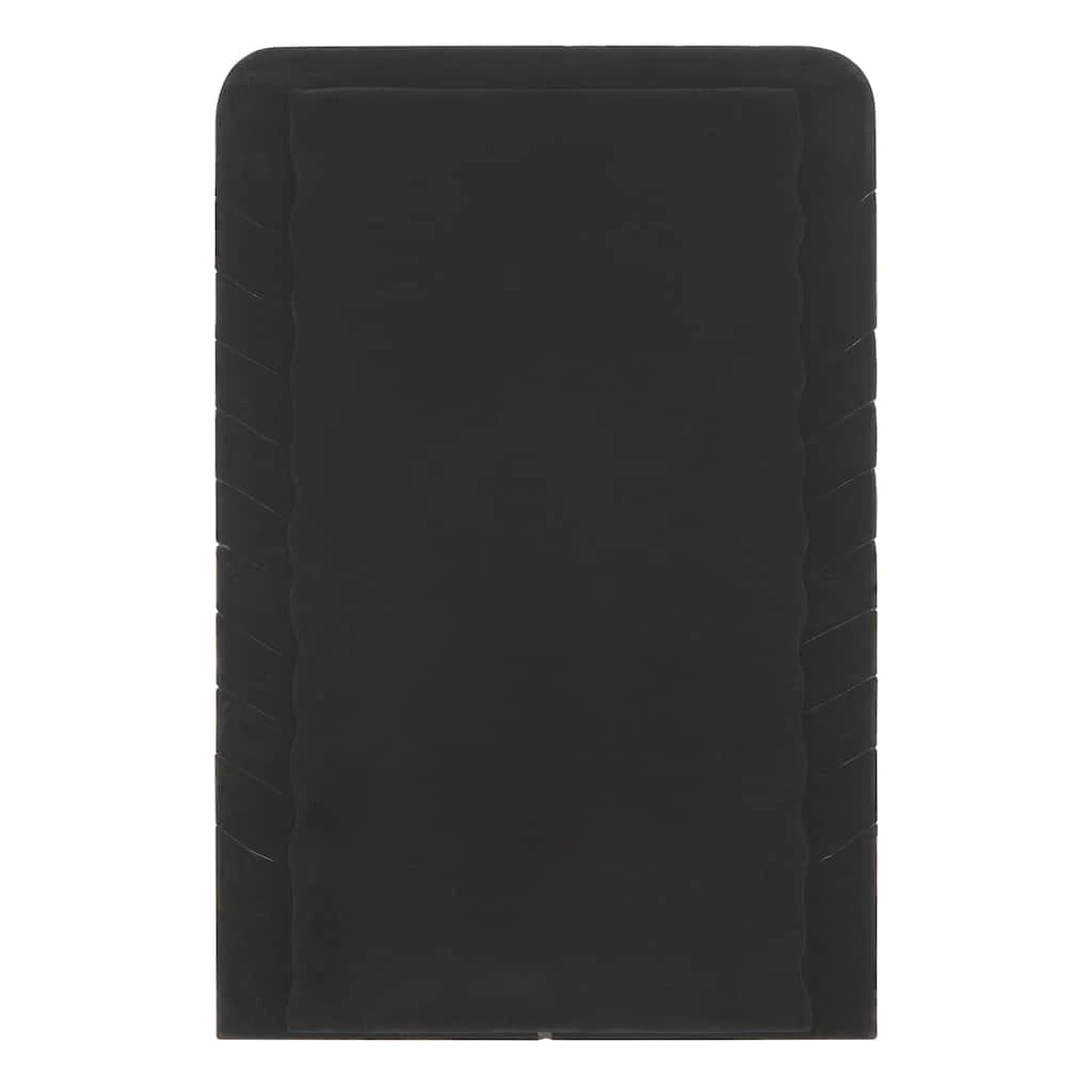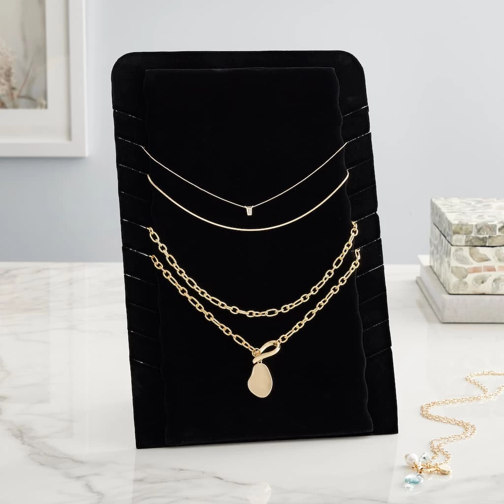Dramatically display your necklace collection with this elegant black velvet stand! It’s an excellent backdrop for showing off the details in bead, chain and pendant designs. Simple easel style support holds stand at a slight angle for ideal viewing and display. Matching notches on either side hold up to 10 necklaces in place at a time.
