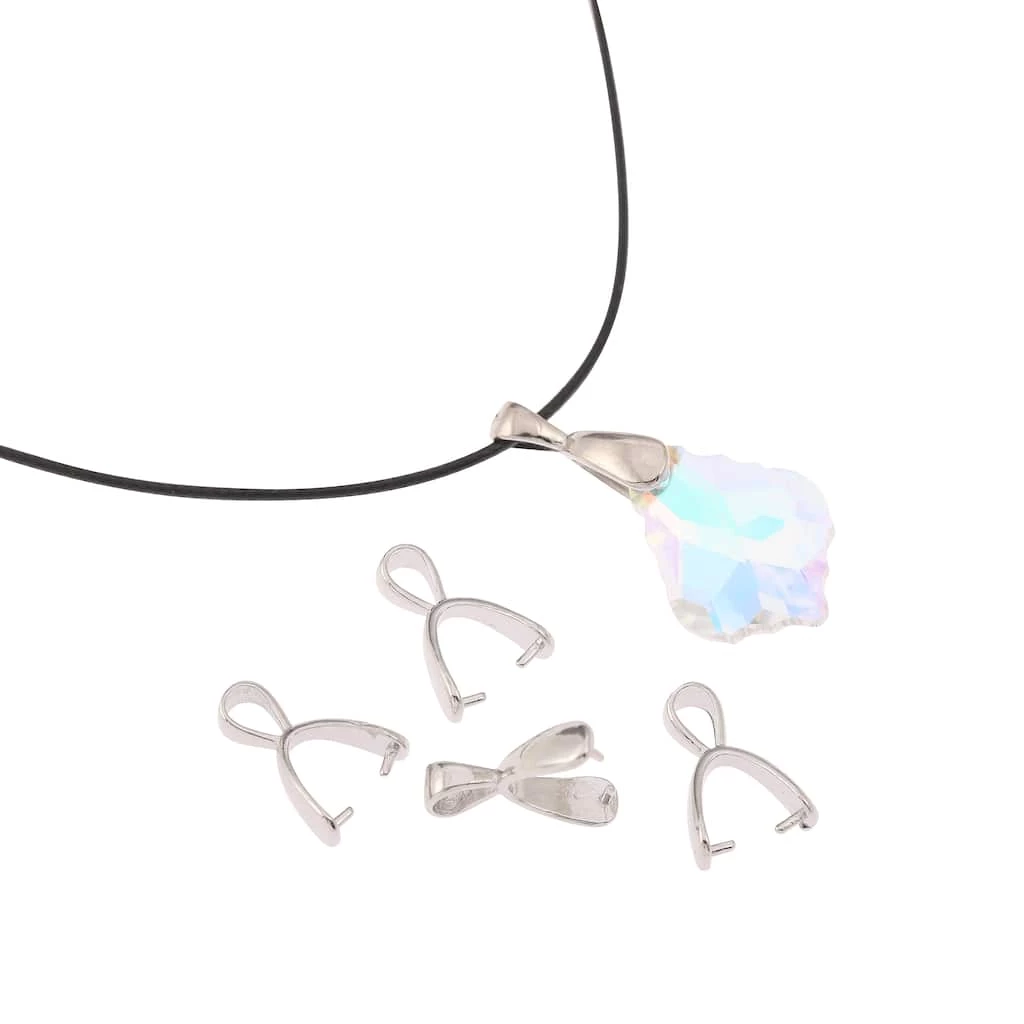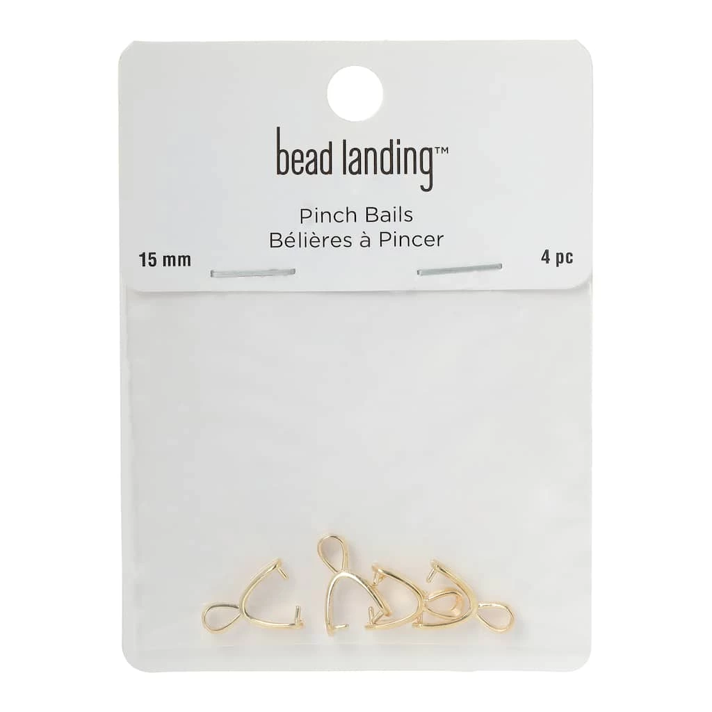 A pinch bail is a clever little device that makes it easy to create a necklace pendant or an earring dangle from a bead. Simply squeeze or pinch the outer portion of the finding until the pointed ends begin to enter the holes of the bead and slowly close until both points are inside the bead hole. Pinch bails are also great for pendants and glass chandelier prisms.