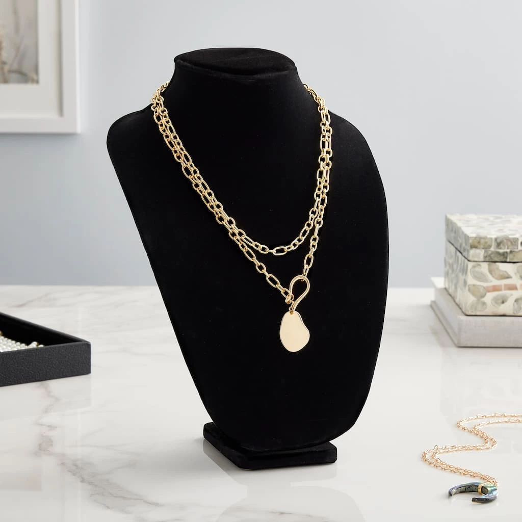Elegantly display your necklaces and chains on this black velvet necklace stand. It provides a stylish backdrop for displaying a full range of necklace styles and lengths.