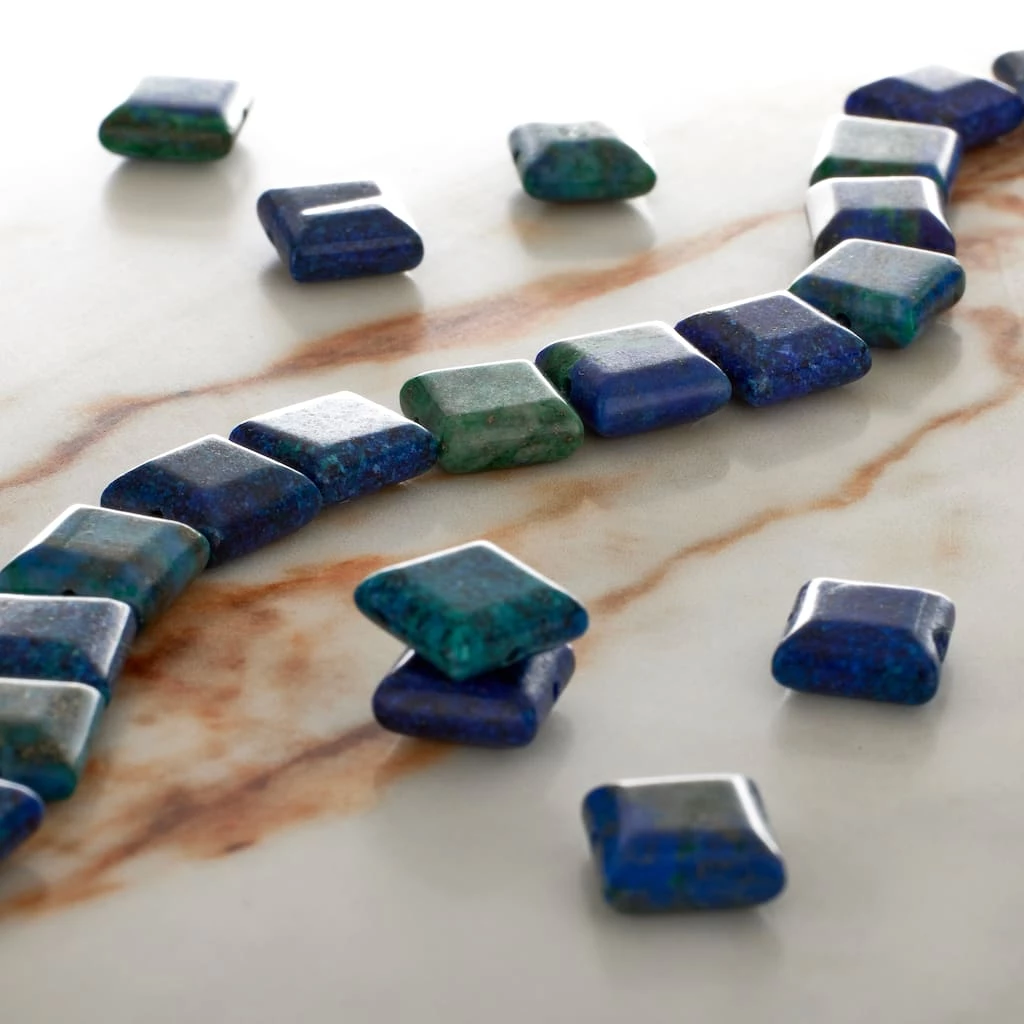 These striking square chrysocolla beads will add an eye-catching appeal to your accessory creations. On their own or mixed with complimentary stones and charms, these beads will make lovely necklaces, bracelets and earrings and are also a wonderful accent for home dรฉcor projects and other crafts.