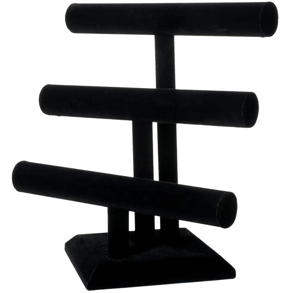 Elegantly display your handmade jewelry creations! This necklace stand provides a stylish black backdrop for displaying three rows of bracelets, watches or short necklaces.