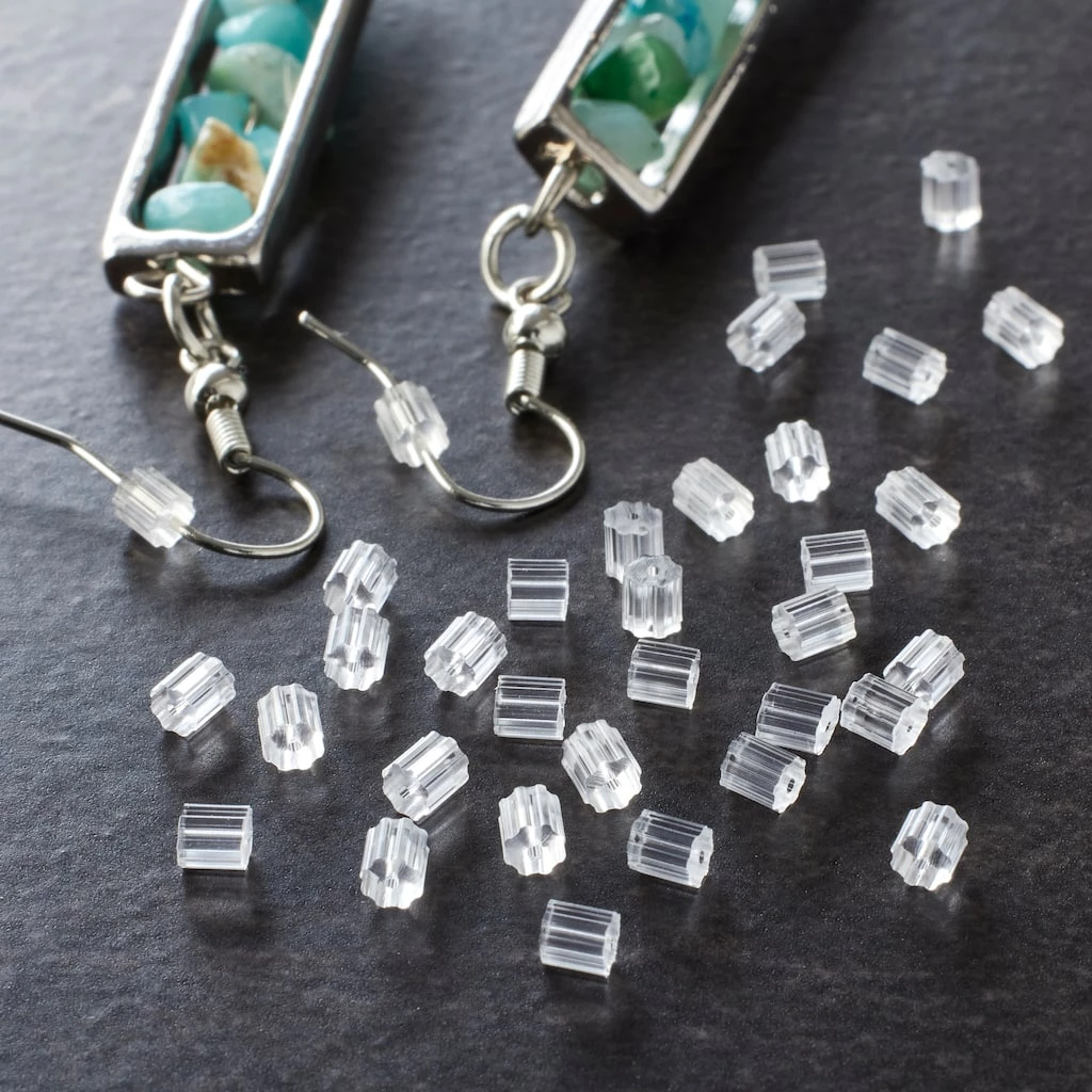 Never lose an earring again! These clear plastic earring backings slip on the back side of your earwires to keep your earrings securely on your ears. Plus, if you sell your handmade earrings, they are ideal for preventing earrings from sliding off display cards.