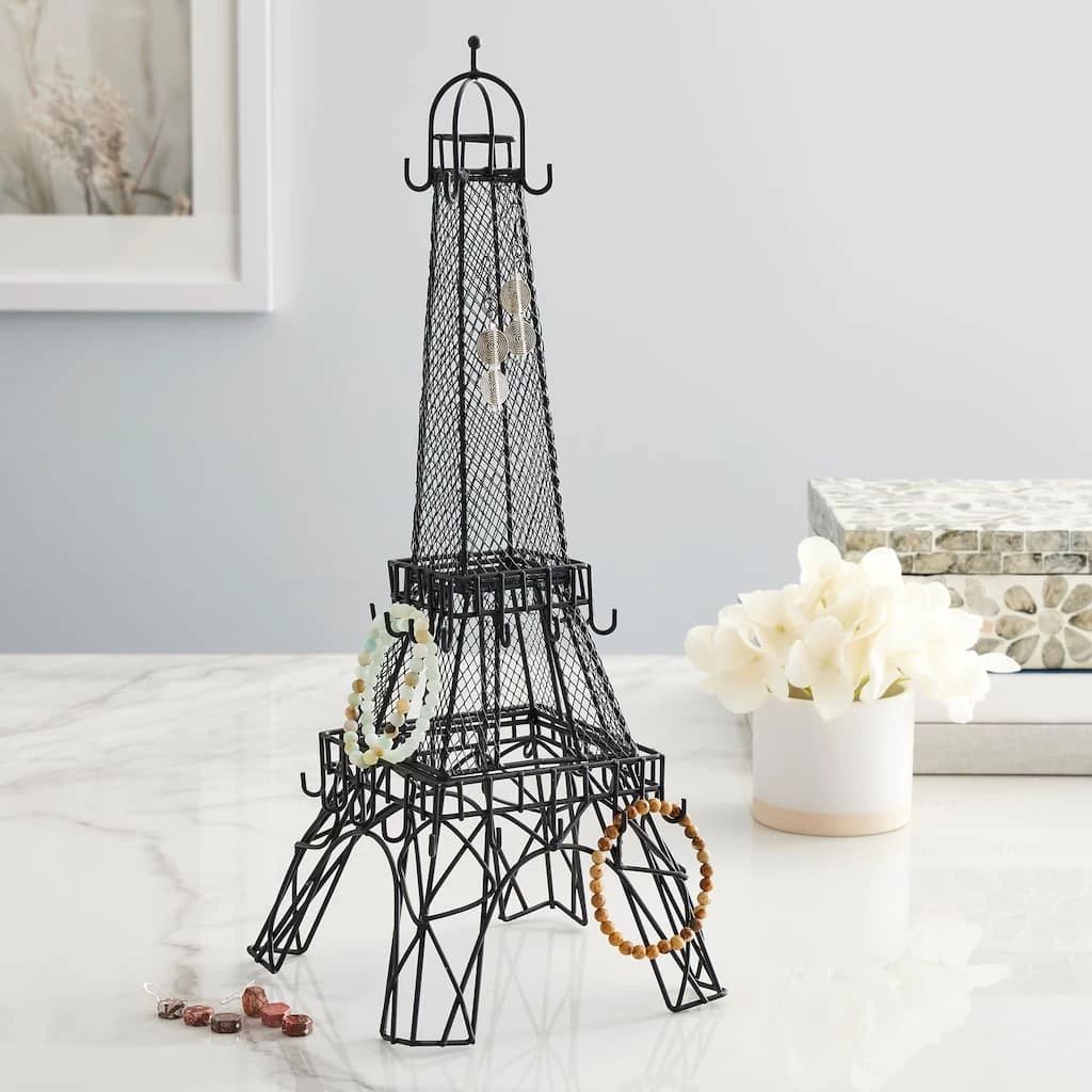 Bring the Eiffel Tower to your bedroom! This black, steel edifice holds a bunch of jewelry. It has four hooks at the top, 12 hooks in the middle and 16 hooks below โ perfect for rings, bracelets or chains up to 14-3/4″ long. The mesh holds dozens of earrings, including fish hook, lever, latch, screw or push back.