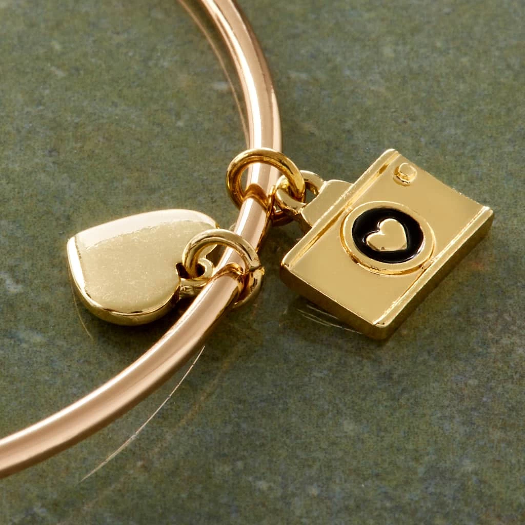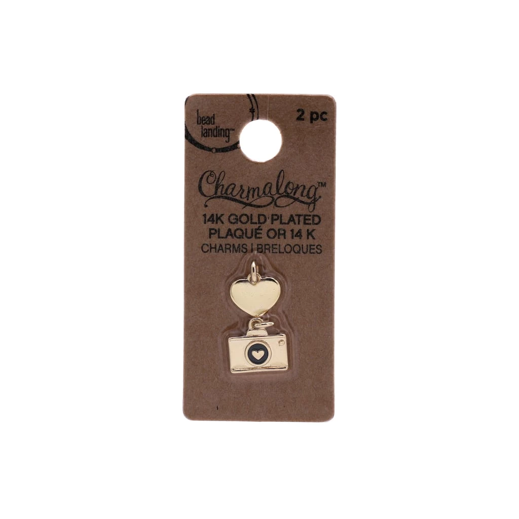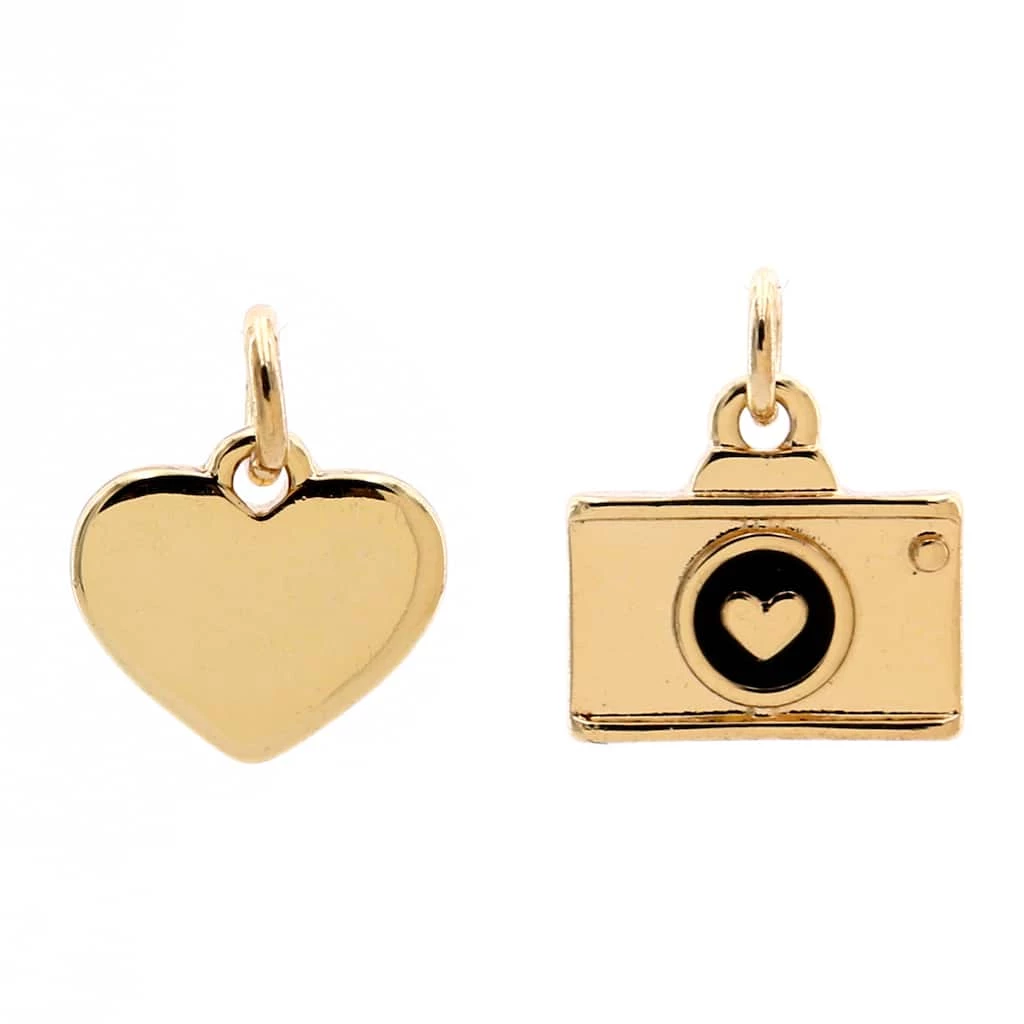 These 14k gold plated heart and camera charms will be a stunning addition to your jewelry collection. Place these loving charms on a Charmalong bracelet to create a fun accessory. You can combine with other spacers and charms to make a bold statement piece.