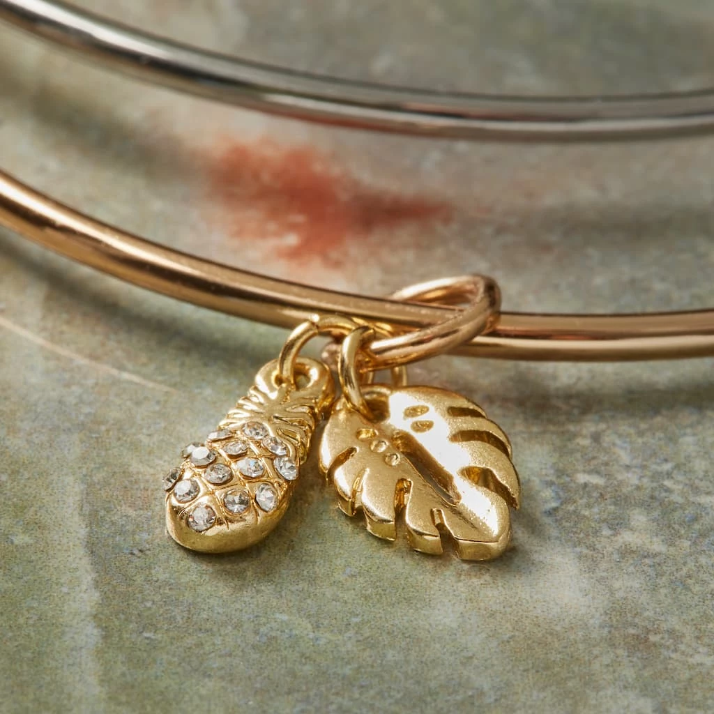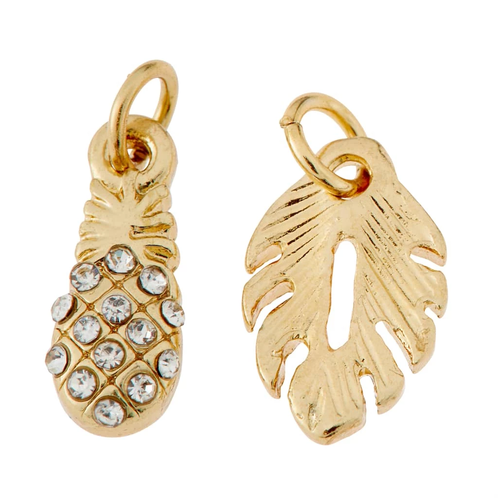 These 14k gold plated pineapple and leaf charms will be a stunning addition to your jewelry collection. Slide these tropical loving charms on a Charmalong leather band to create a fun accessory. You can combine with other spacers and charms to make a bold statement piece.
