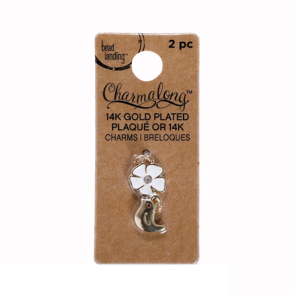 These 14k gold plated white flower and bird charms will be a stunning addition to your jewelry collection. Slide these nature loving charms on a Charmalong leather band to create a fun accessory. You can combine with other spacers and charms to make a bold statement piece.