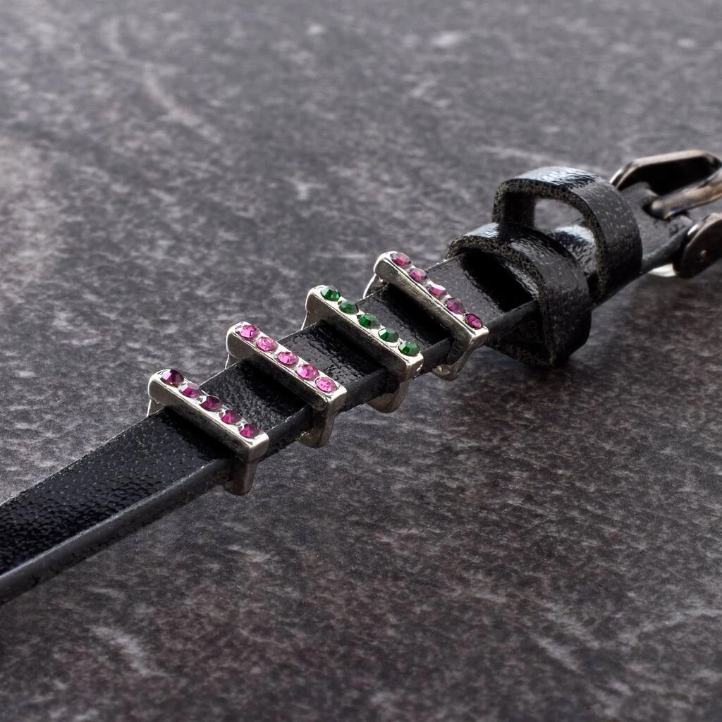 These colorful crystal accents on silver colored bar slider charms will be a stunning addition to your jewelry collection. Slide these bar spacers on a Charmalong leather band to create a fun accessory. You can combine with other spacers and charms to make a bold statement piece.