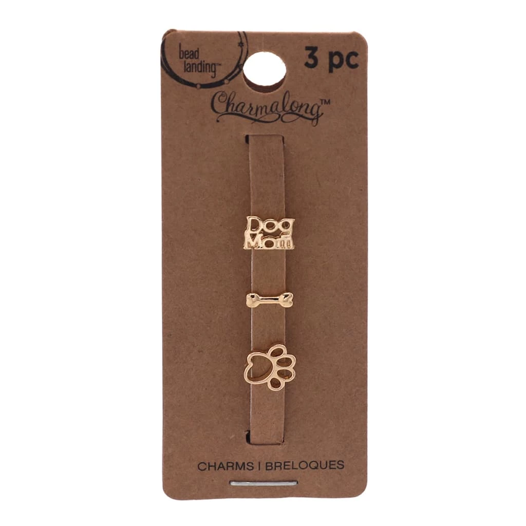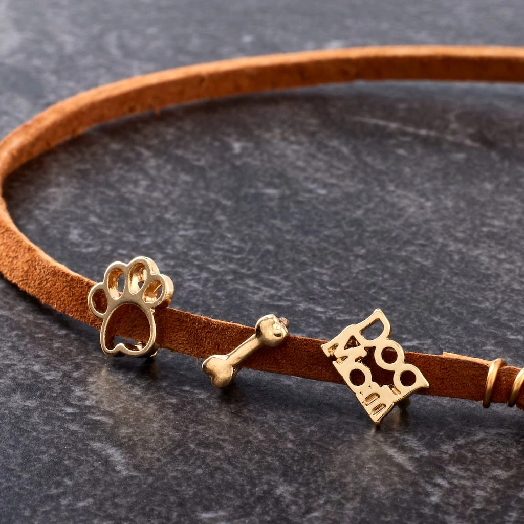 These gold colored dog iconic slider charms will be a stunning addition to your jewelry collection. Slide these dog loving charms on a Charmalong leather band to create a fun accessory. You can combine with other spacers and charms to make a bold statement piece.