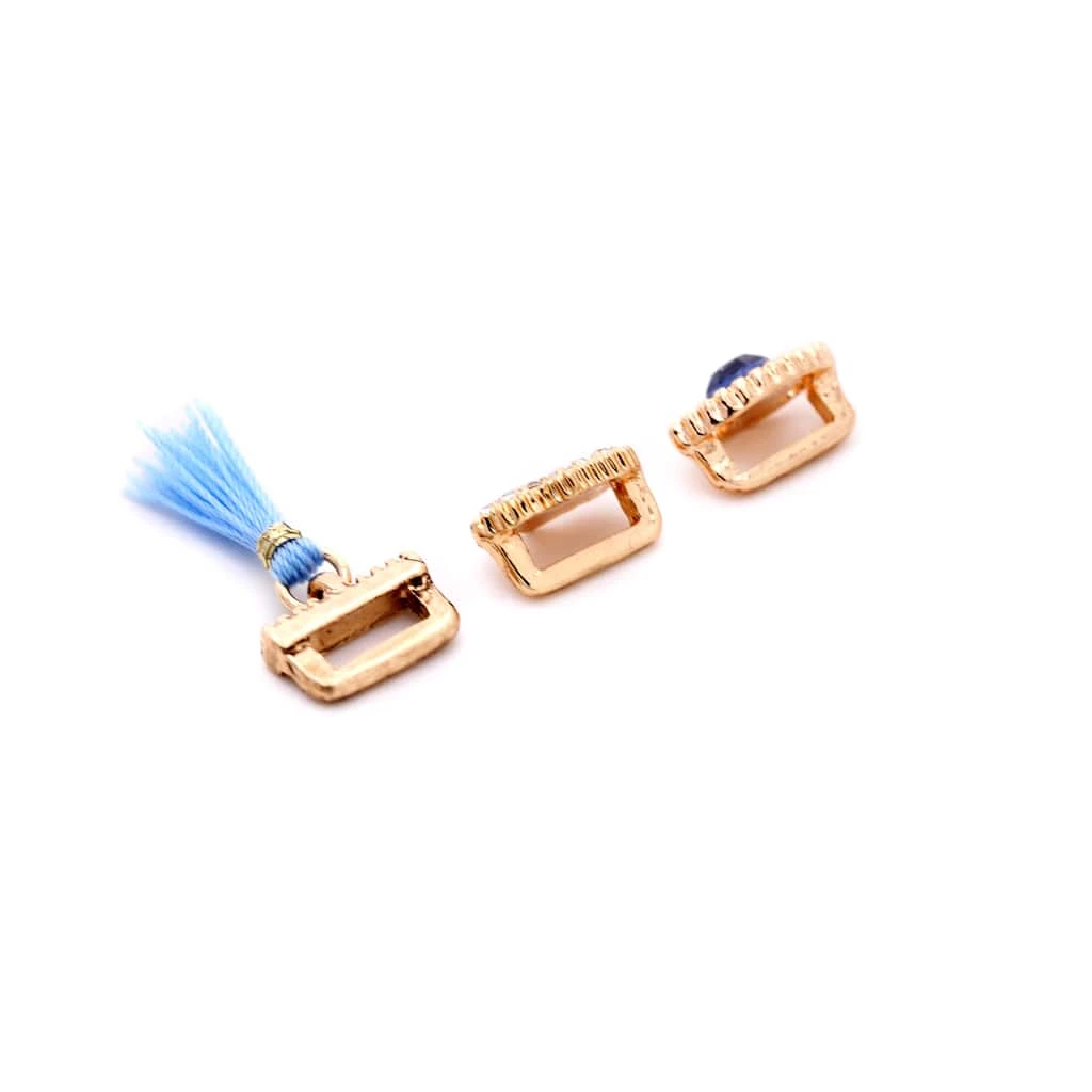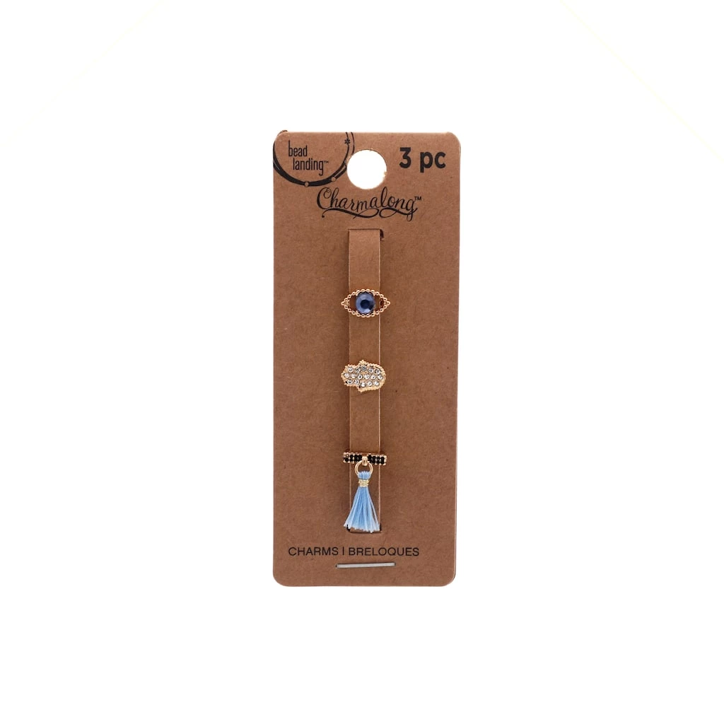 These gold colored with blue accents of eye, hamsa and tassel slider charms will be a stunning addition to your jewelry collection. Slide these gold colored charms on a Charmalong leather band to create a fun accessory. You can combine with other spacers and charms to make a bold statement piece.
