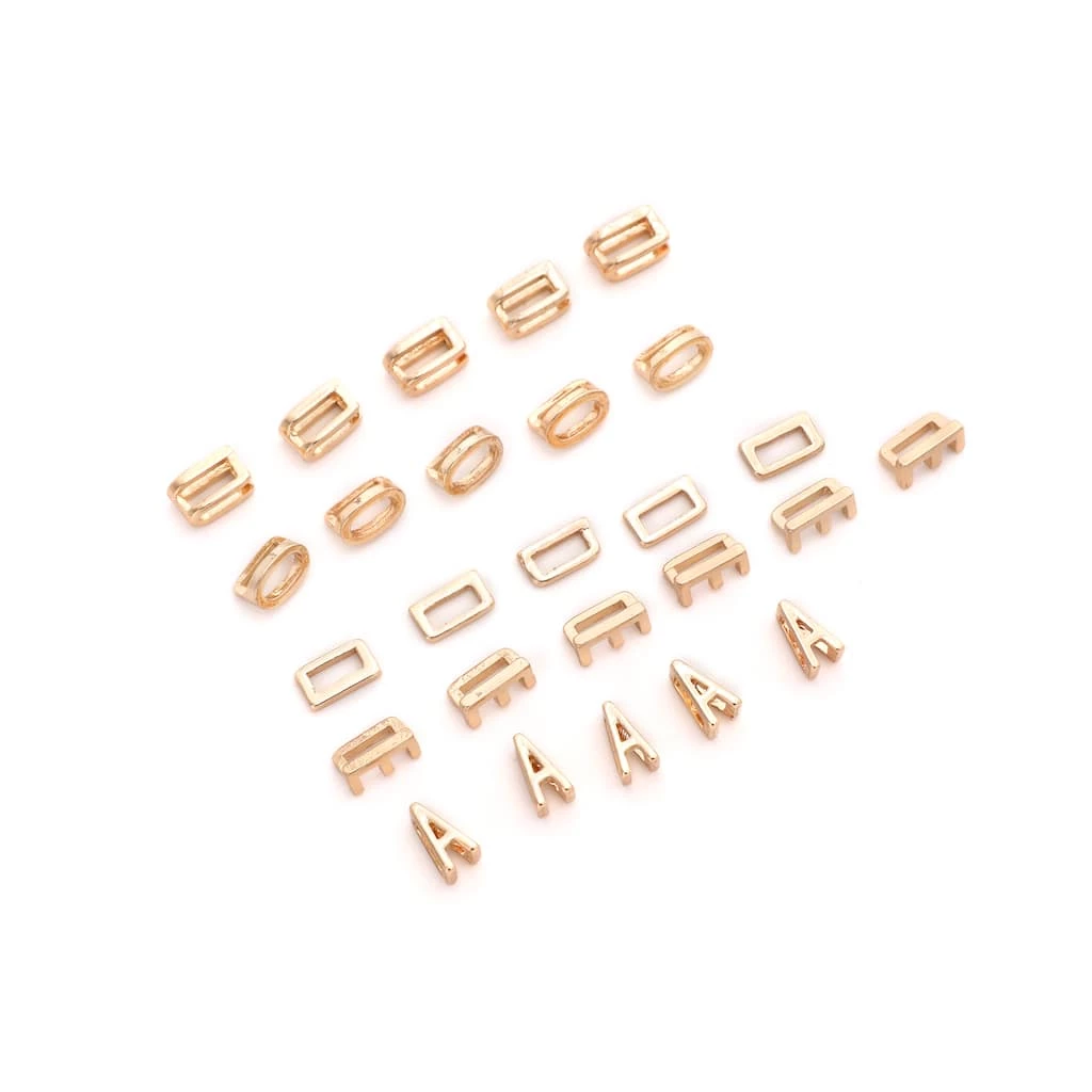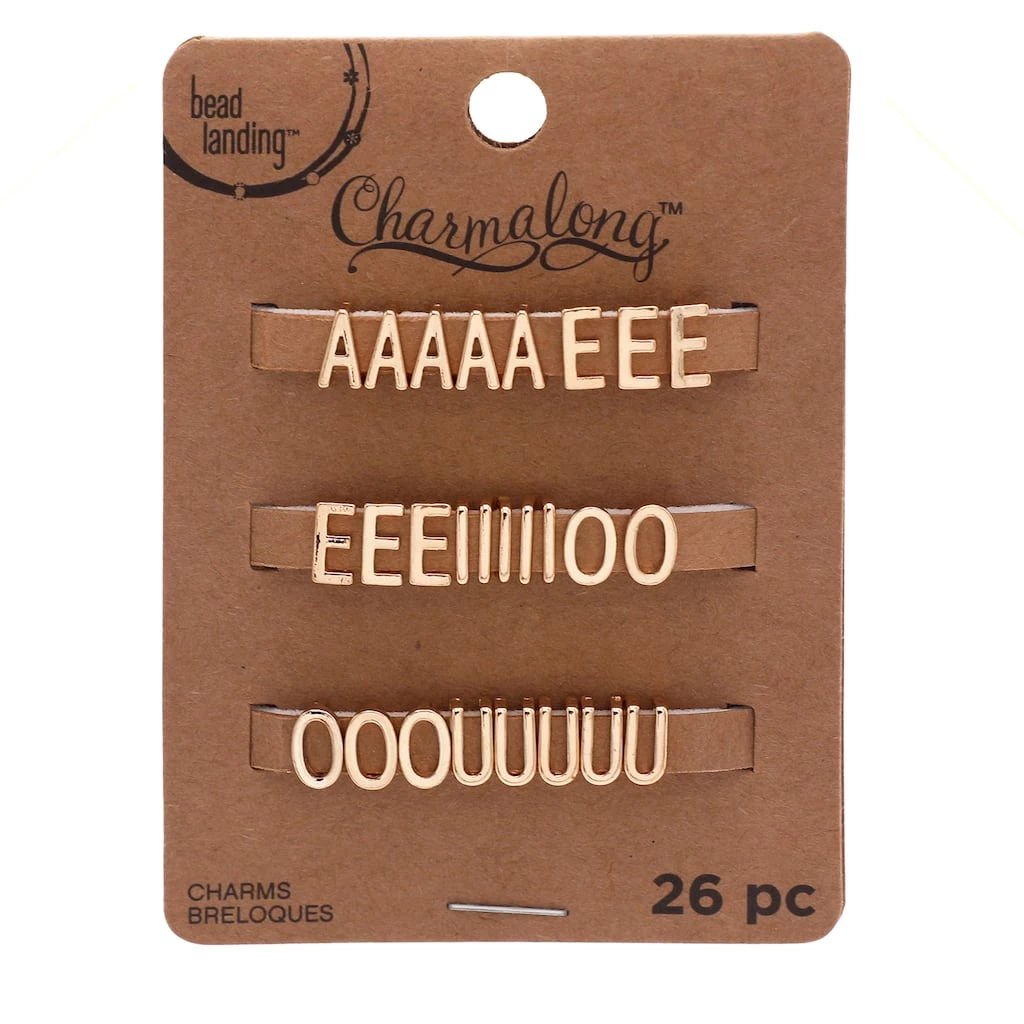 These gold vowel letters slider charms will be a stunning addition to your jewelry collection. Slide these gold colored letters charms on a Charmalong leather band to create a fun accessory. You can combine with other spacers and charms to make a bold statement piece.