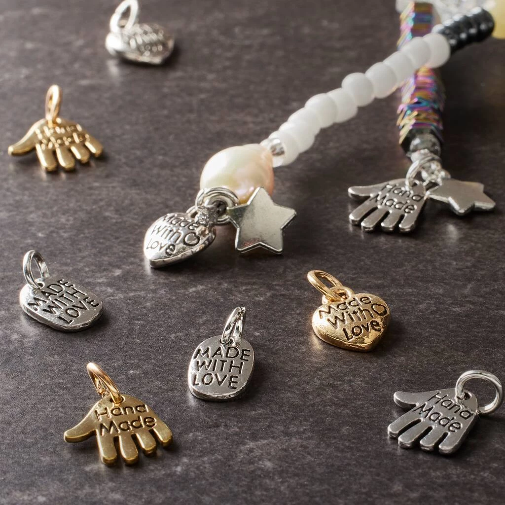 Slide these charms by Bead Landing on to a ribbon as you tie gift boxes, chocolate bundles or cosmetics pack. They are ideal to express your love and indicate if the contents of the box are handmade. These charms can also be used to make bracelets, anklets and other jewelry pieces.