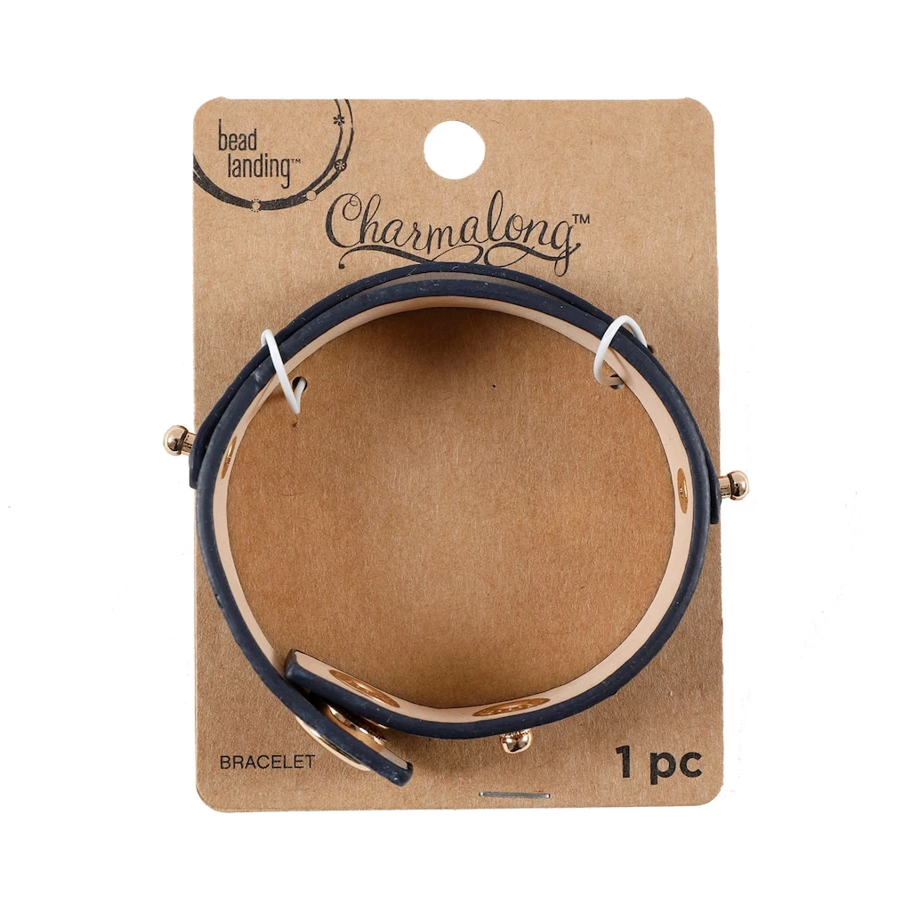 This navy with gold colored accents cuff slider bracelet will be an added addition to your jewelry collection. You can clip on your interchangeable band and slide your Charmalong charms and bands onto this bracelet for a fun personalized accessory piece. You can combine with other spacers and charms to make a bold statement piece.