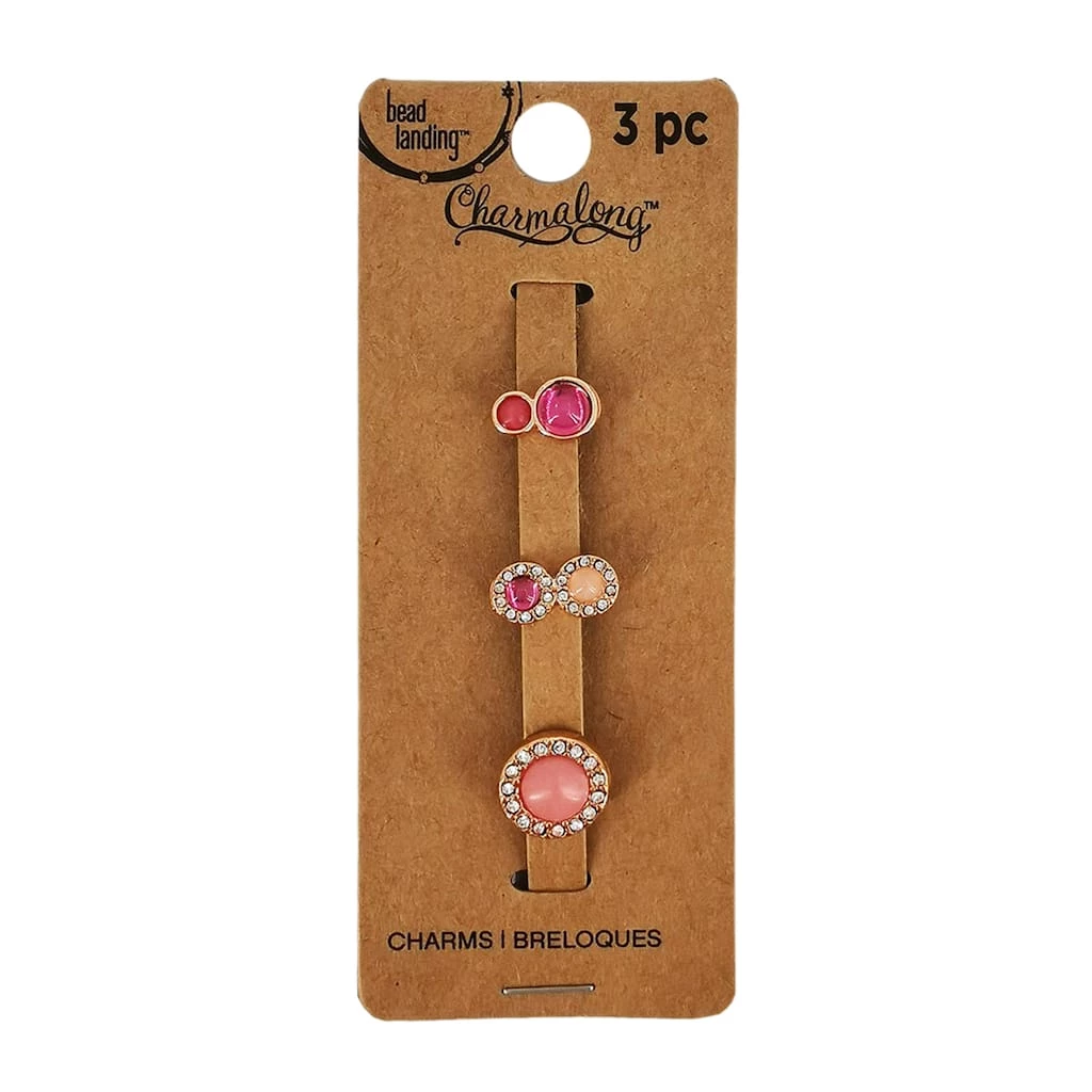 These pink stones with clear crystal accents and gold colored band slider charms will be a stunning addition to your jewelry collection. Slide these round charms on a Charmalong leather band to create a fun accessory. You can combine with other spacers and charms to make a bold statement piece.