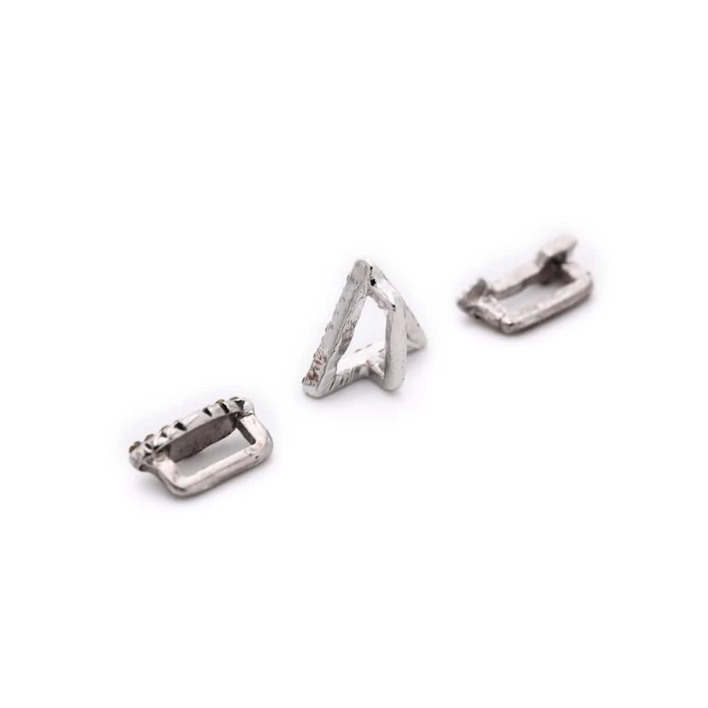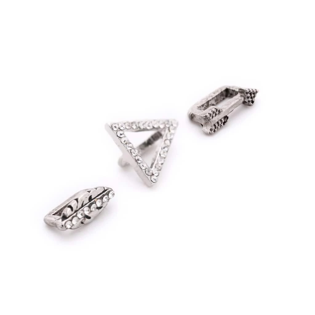 These rhodium arrow, leaf and triangle with clear accents slider charms will be a stunning addition to your jewelry collection. Slide these antique rhodium loving charms on a Charmalong leather band to create a fun accessory. You can combine with other spacers and charms to make a bold statement piece.
