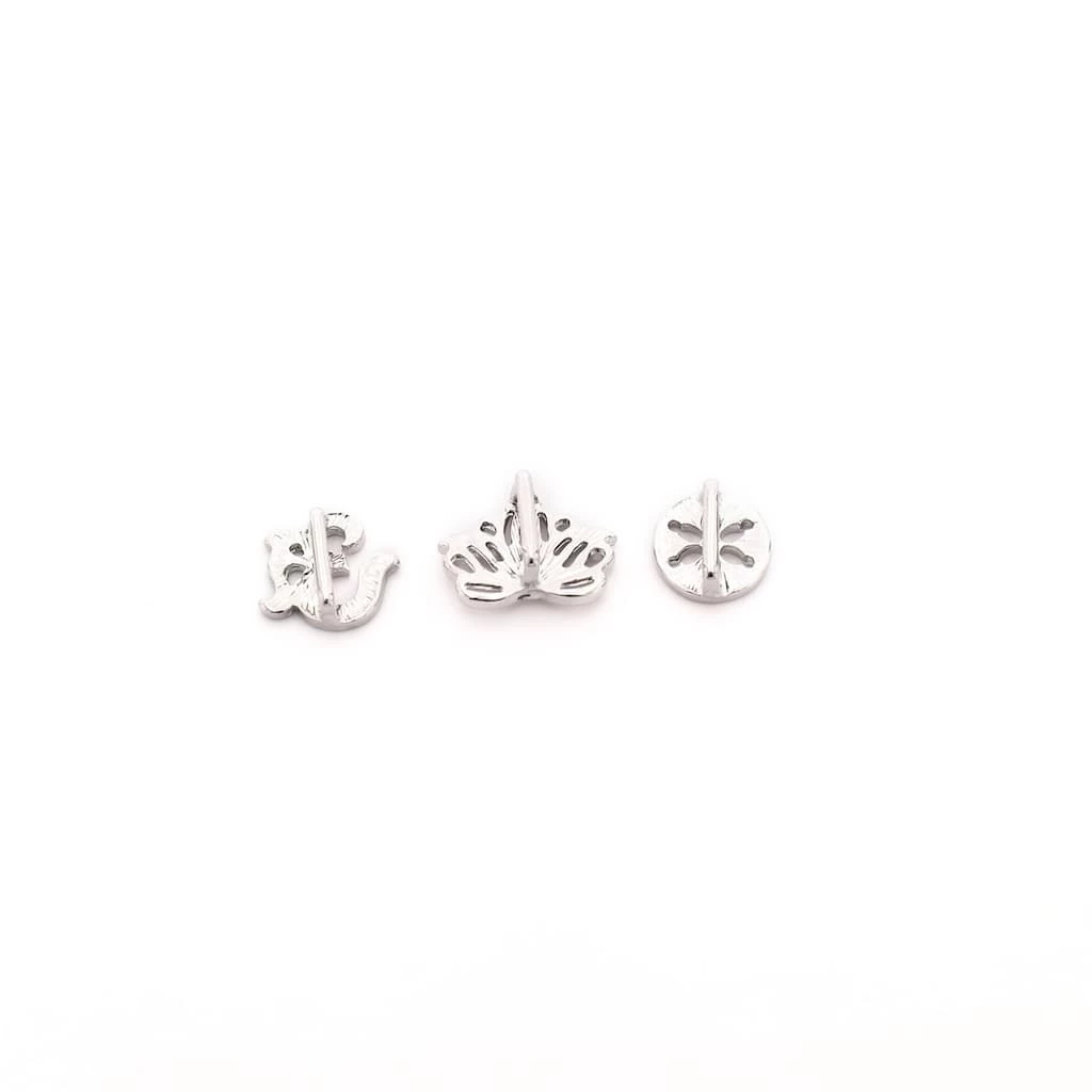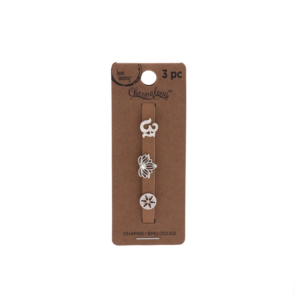 These rhodium om and lotus slider charms will be a stunning addition to your jewelry collection. Slide these rhodium charms on a Charmalong leather band to create a fun accessory. You can combine with other spacers and charms to make a bold statement piece.
