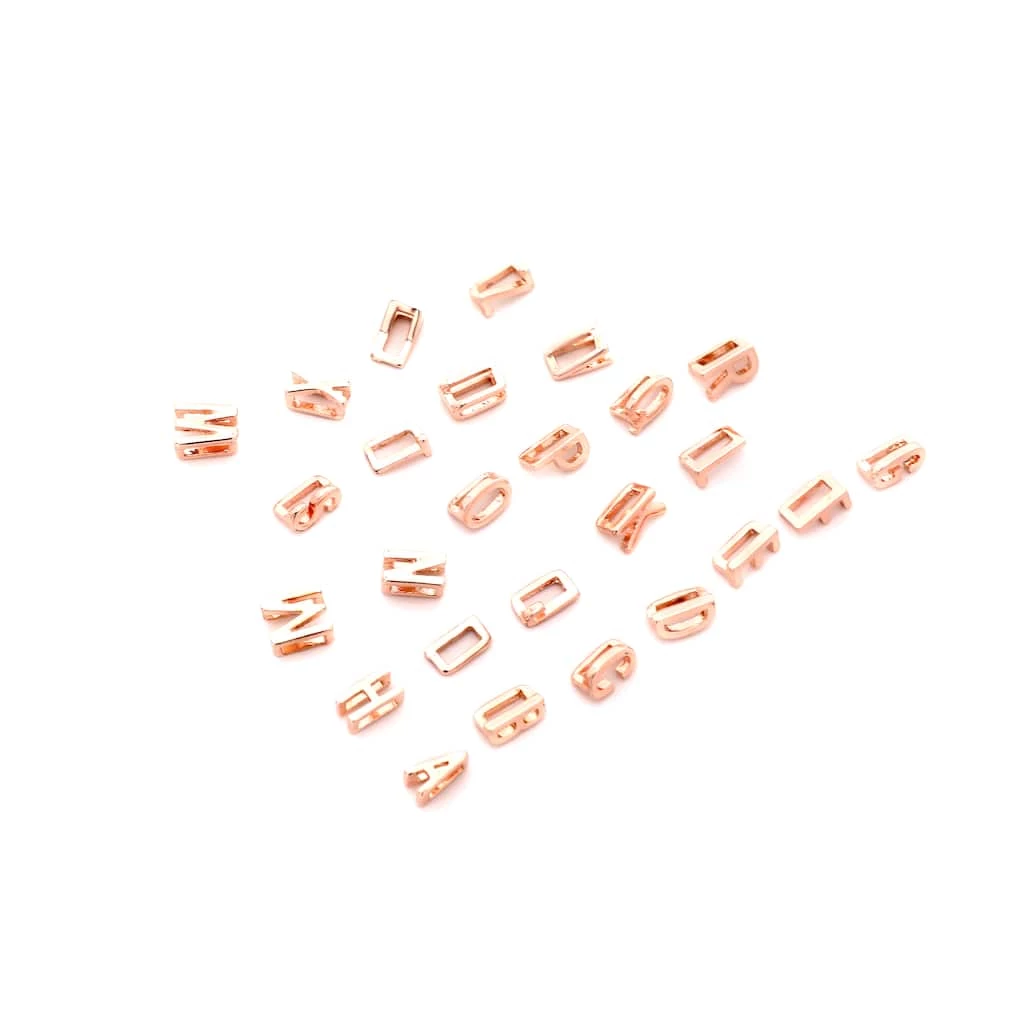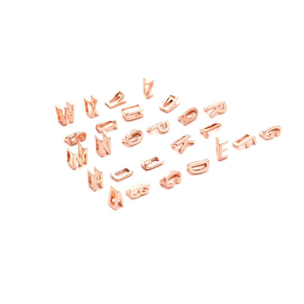 These rose gold alphabet letters slider charms will be a stunning addition to your jewelry collection. Slide these rose gold colored letters charms on a Charmalong leather band to create a fun accessory. You can combine with other spacers and charms to make a bold statement piece.