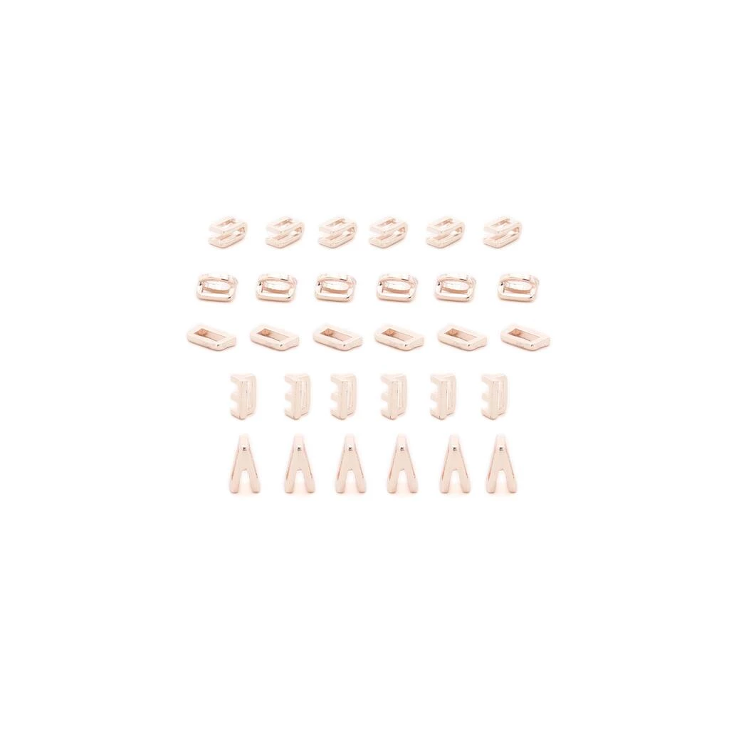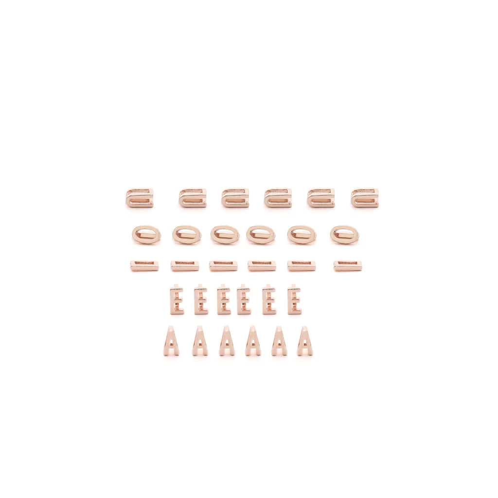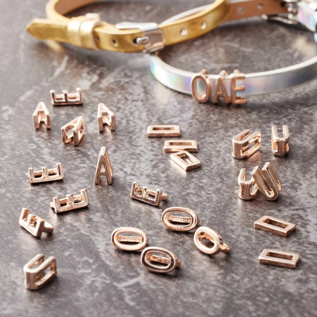 These rose gold vowel letters slider charms will be a stunning addition to your jewelry collection. Slide these rose gold colored letters charms on a Charmalong leather band to create a fun accessory. You can combine with other spacers and charms to make a bold statement piece.