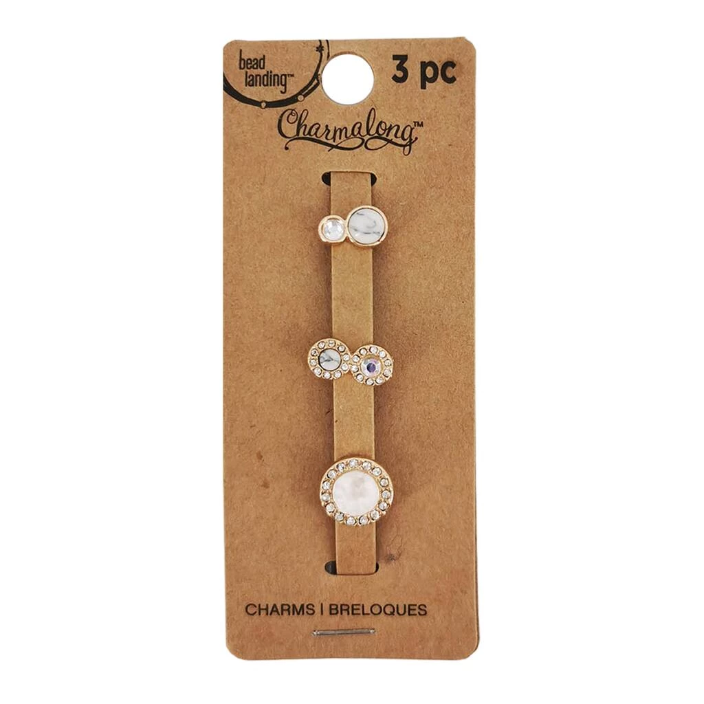 These white stones with clear crystal accents and gold colored slider charms will be a stunning addition to your jewelry collection. Slide these round charms on a Charmalong leather band to create a fun accessory. You can combine with other spacers and charms to make a bold statement piece.