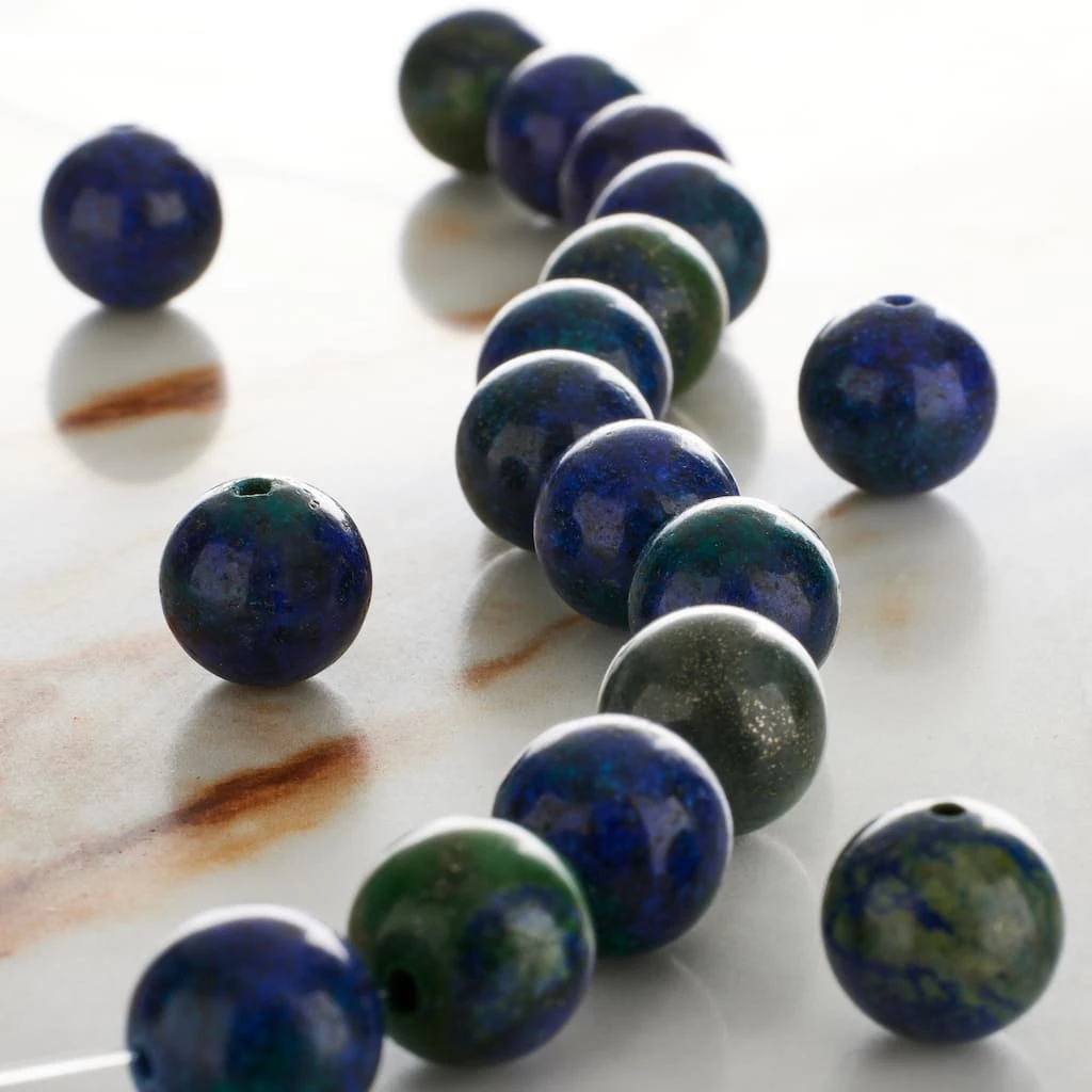 These striking round chrysocolla beads will add eye-catching appeal to your accessory creations. On their own or mixed with complimentary stones and charms, these beads will make lovely necklaces, bracelets and earrings and are also a wonderful accent for home décor projects and other crafts.