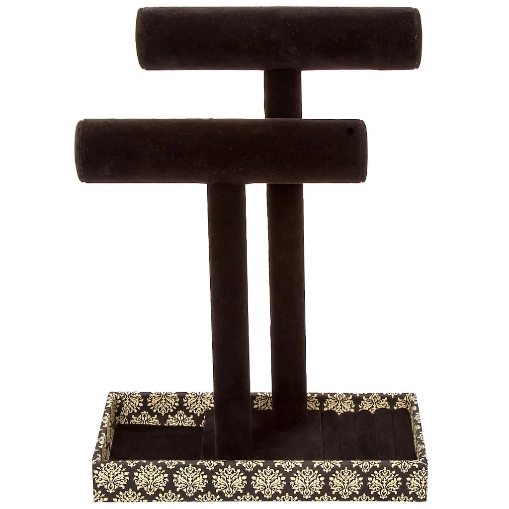 Simple, attractive velvet bar jewelry display rests in a handy black and cream damask print tray. Velvet interior of tray conveniently holds rings and other small jewelry items.