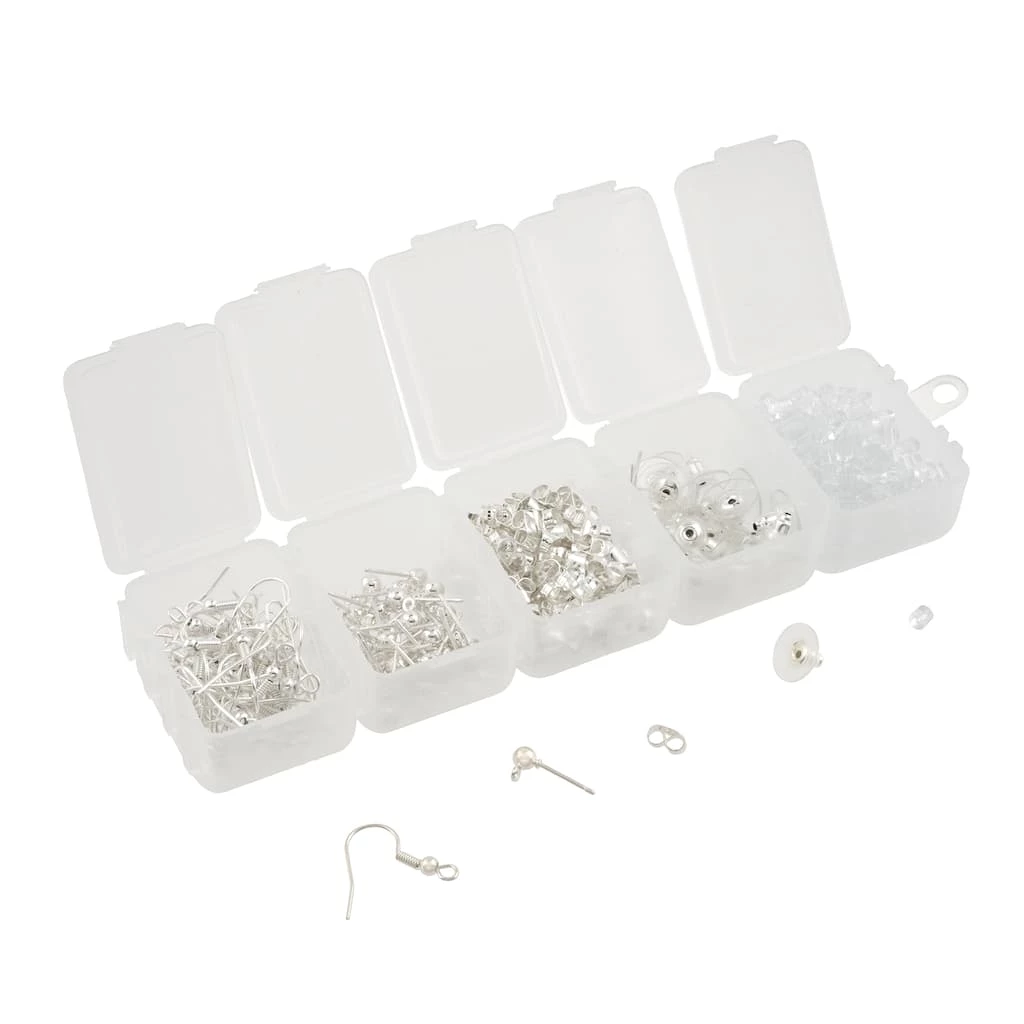 DIY Earring Finding Kit includes plastic storage case with earring findings in gold, silver and rhodium. Five different findings are included.