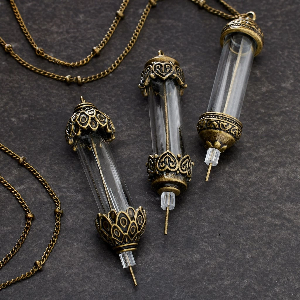 Create necklaces or DIY design with this set of vials. Fill these tiny glass vials with small charms, glitter, tiny gem chips and tassels to create unique pendants.