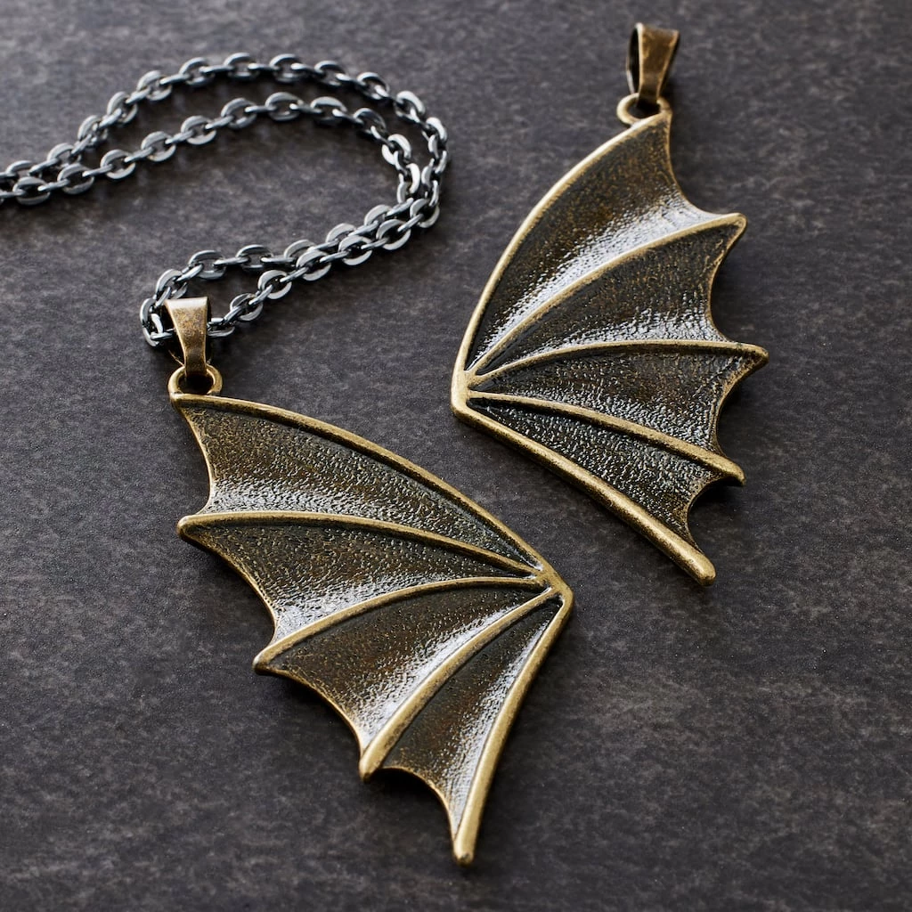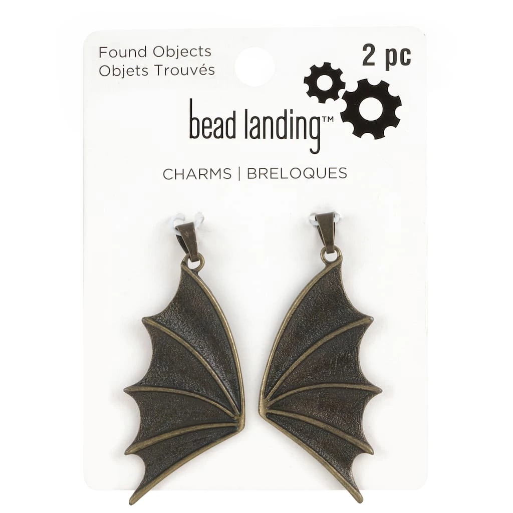 Create a unique necklace with this brass colored charm set. This set of 2 wing charms can be used for other jewelry types and keychains.