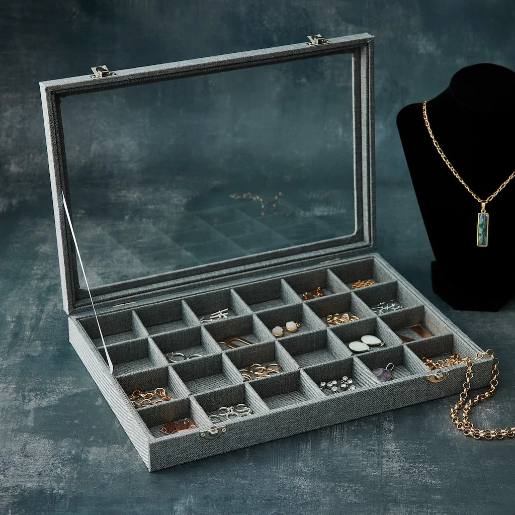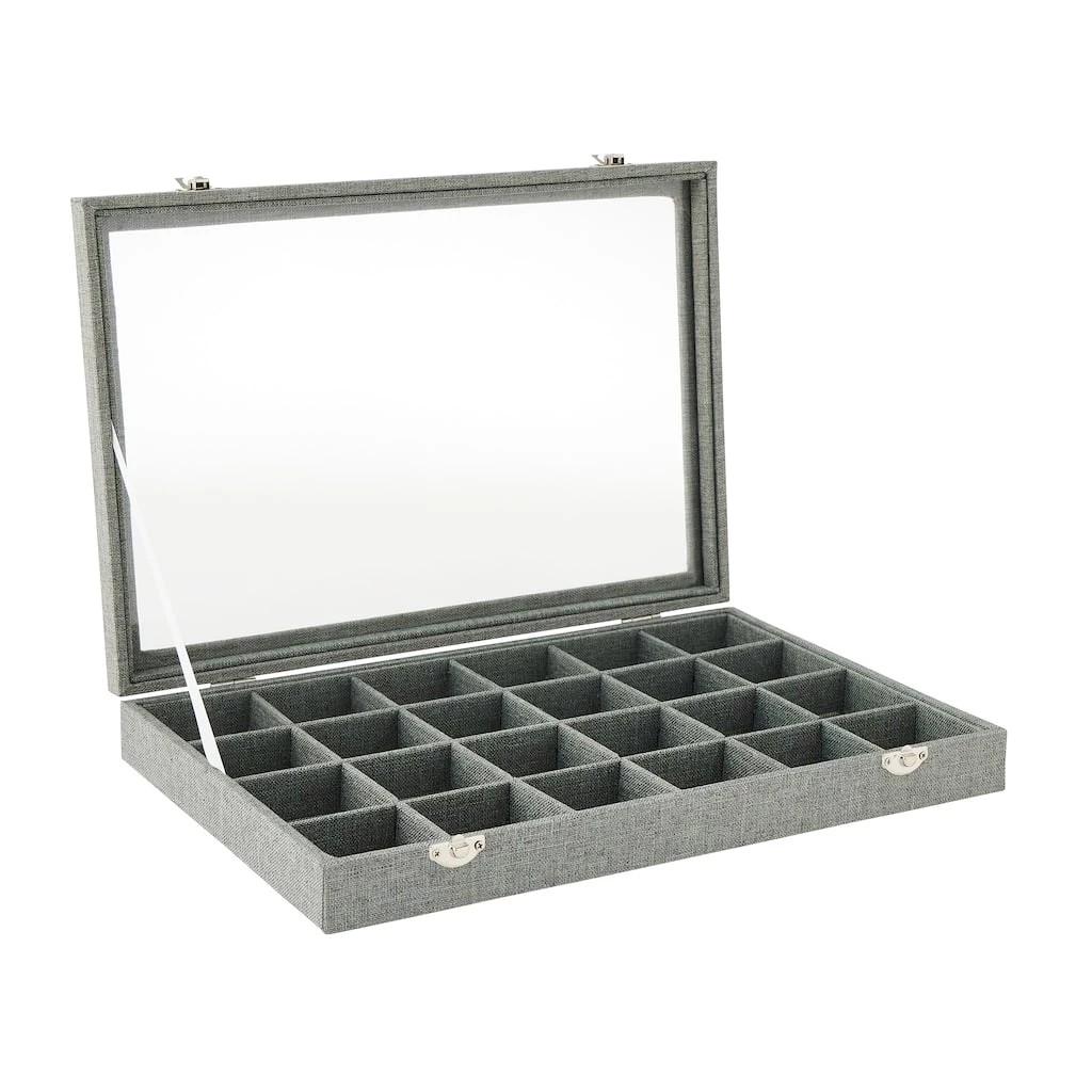 Organize your jewelry neatly in this lovely gray tray by Bead Landing. You can use its tiny compartments to store your earrings, charms, rings and beads. This elegant fabric-covered wooden box also makes the perfect birthday present for a loved one.
