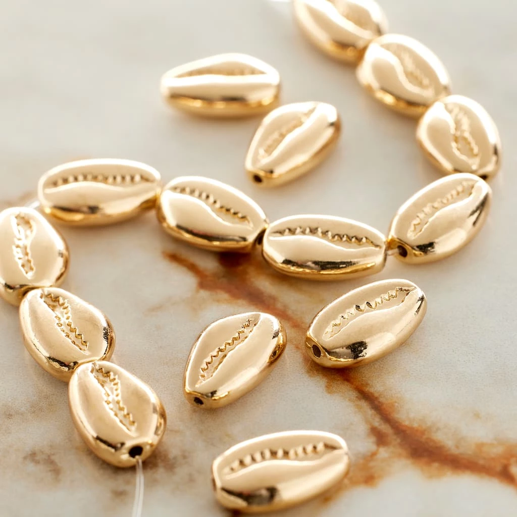 These gold conch-shaped beads are perfect for crafting bracelets, necklaces, and other cool accessories. Pair the finished project with a stylish outfit to complete the look.