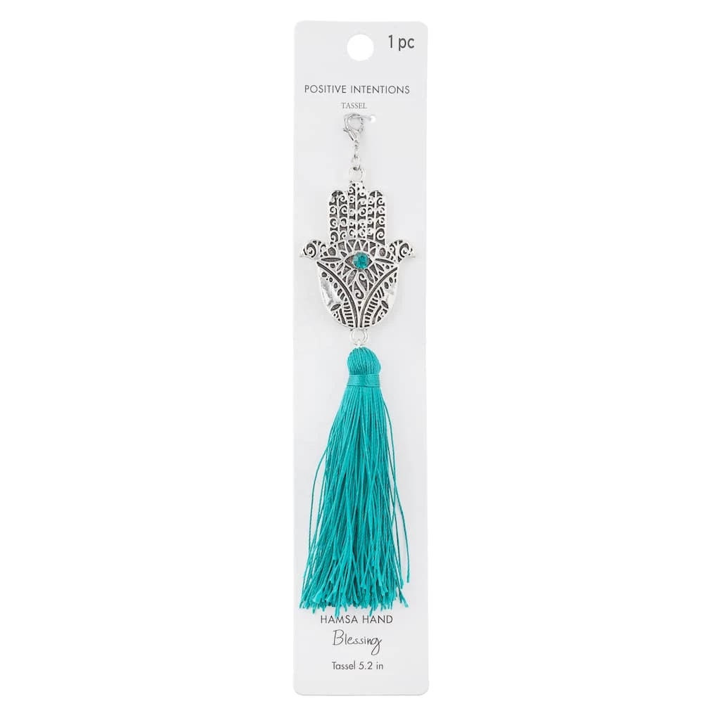 This hamsa and turquoise tassel pendant by Bead Landing is perfect for creating unique jewelry pieces. Pair it with charms and slide them onto a plain chain to create a dazzling necklace.